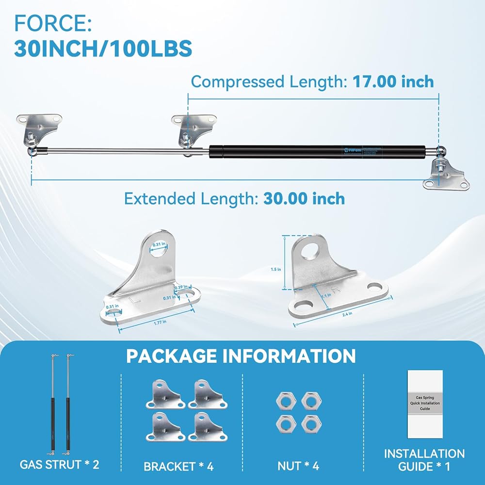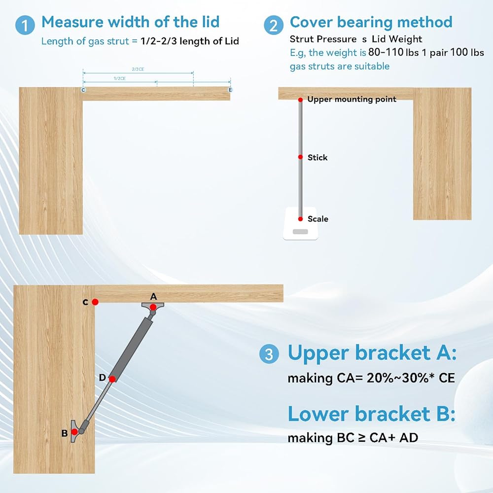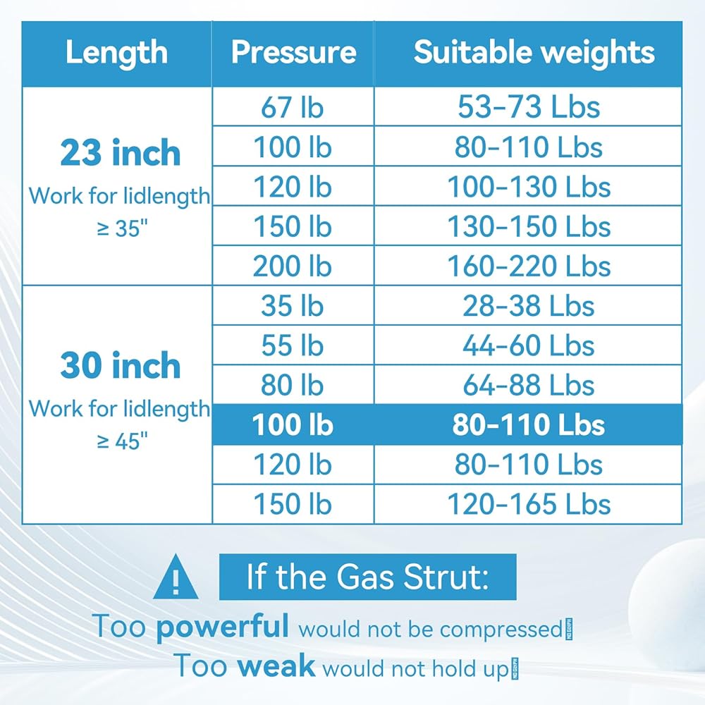 ❤️🔥20 INCH GAS SPRINGS -- 100lbs/445N shocks will be suitable for lids or doors weighing between 80 pounds and 110 pounds! Side length ≥ 32 inch; Note: do measure the lid weight to avoid buy wrong items.