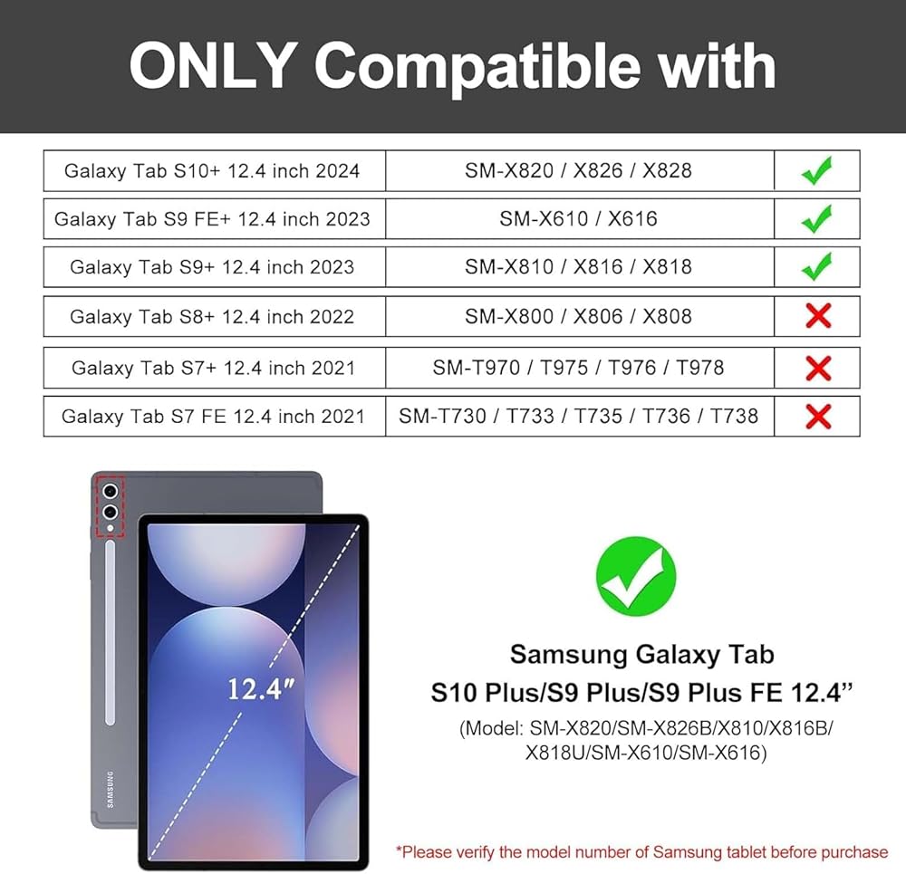 Compatibility: Compatible with Samsung Galaxy Tab S8+/S8 Plus 2022 (SM-X800/X806) & Tab S7 FE 2021 (SM-T730/T733/T736/T738) & Tab S7+/S7 Plus 2020 (SM-T970/T975/T976/T978)