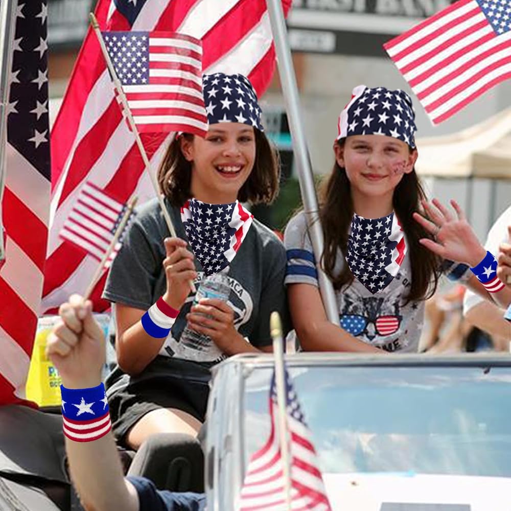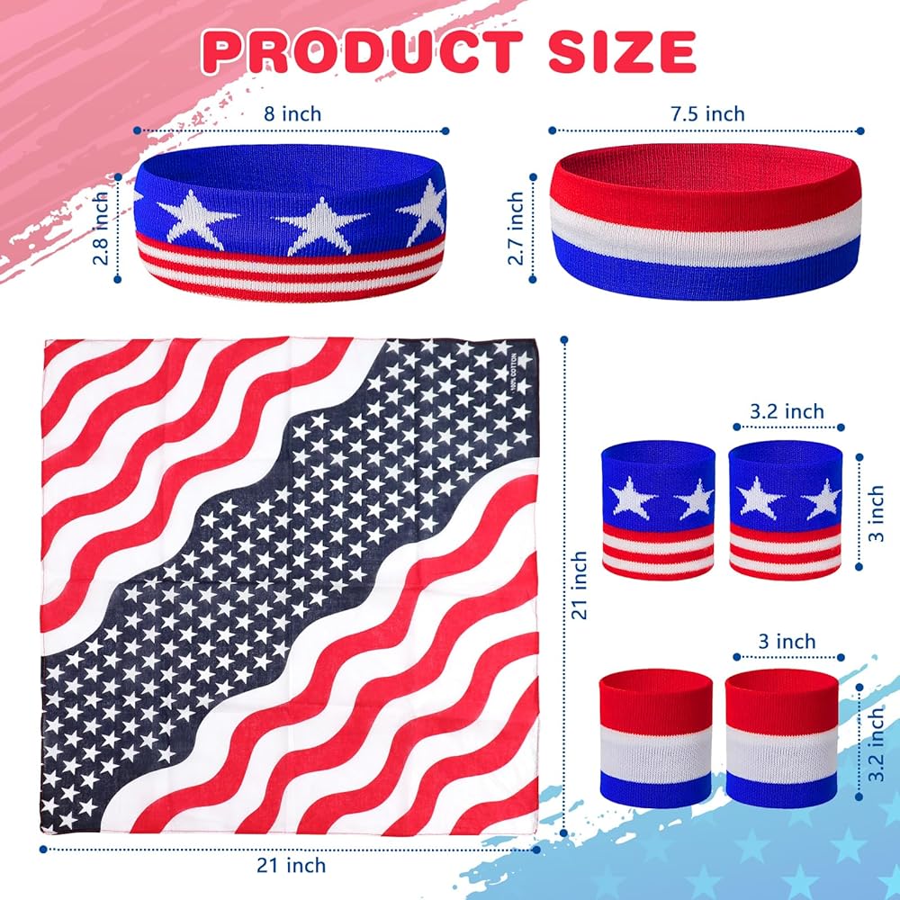 American Flag Headbands: This set includes 8 pieces featuring headbands, sweatbands, wristbands, and bandanas, all showcasing the American flag design in white, blue, and red. These items are classic and eye-catching, adorned with stylish elements like stars and stripes, perfect for expressing patriotism on Independence Day. They also make great accessories for exercise and daily wear.