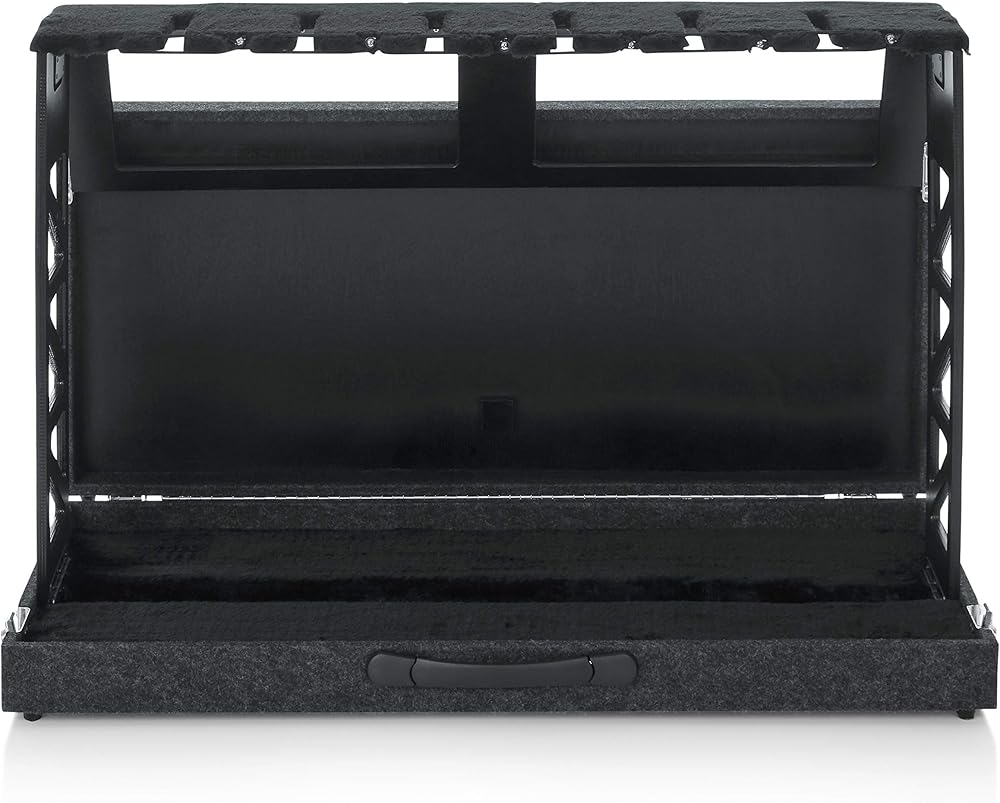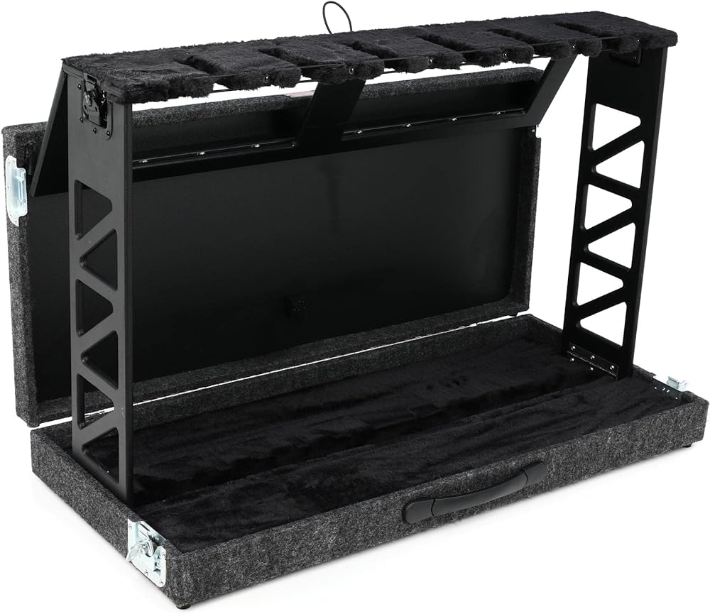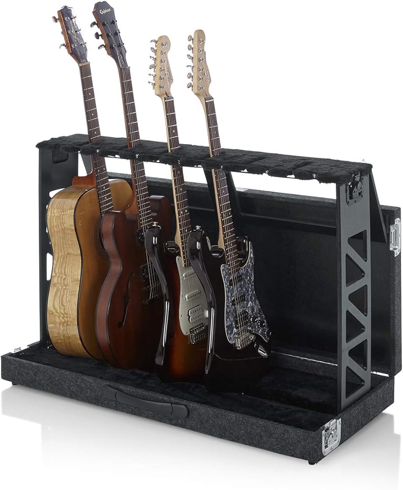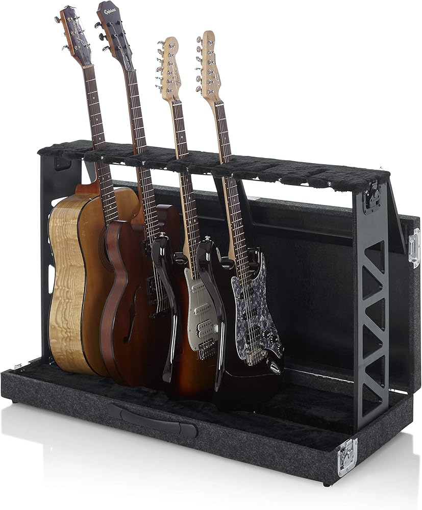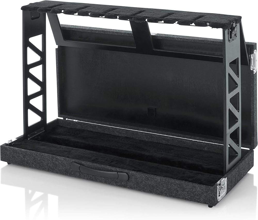 Gator GTRSTD4 Rack style stand opens to holdup to 4 Guitars then folds into a compact carry case when you are ready to pack up. The stand section is able to hold any variation of electric, acoustic, or bass guitars and conveniently folds down and locks into place with recessed twist latches. The interior features black Plush lining and includes elastic secure bands to keep your guitars from sliding out of the stand if it is bumped when in use. The exterior of the stand is constructed of sturdy Baltic birch wood covered in grey carpeting with feet on the back and bottom of the case to prevent wear and extend the life of the product. The Gator rack style stand case combo is flight and travel ready with commercial grade, penn-elcom twist latches, hardware and a rugged, comfortable carry handle.