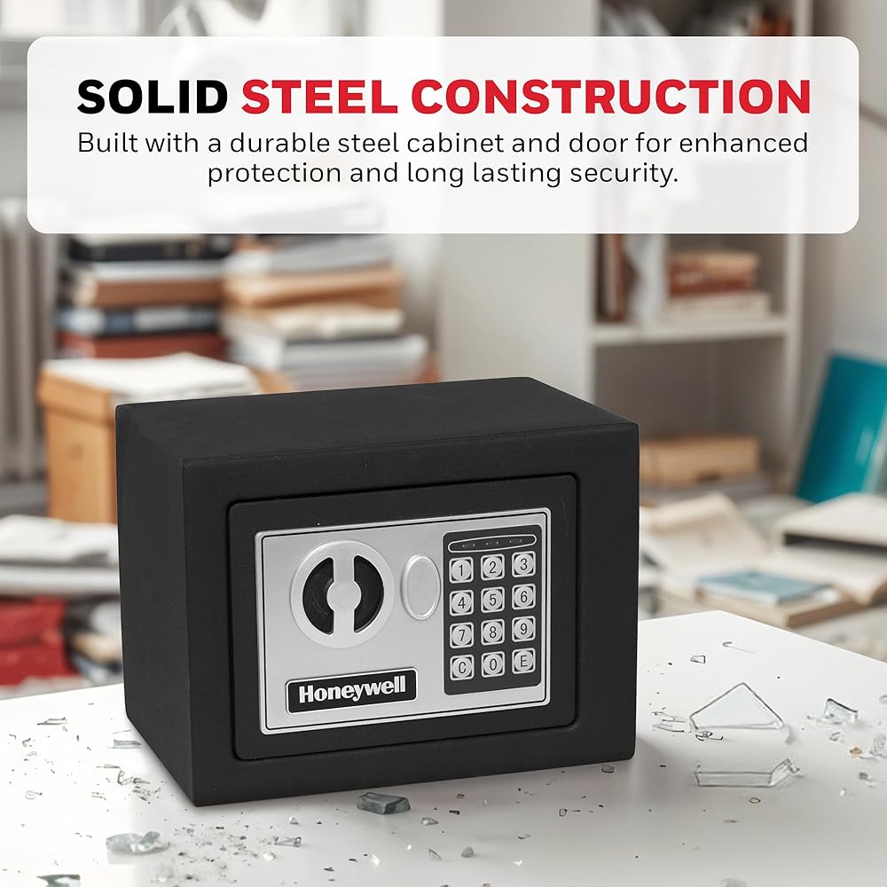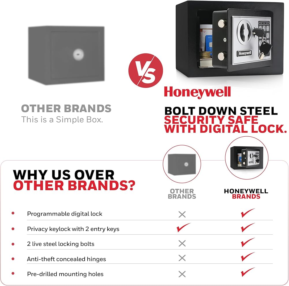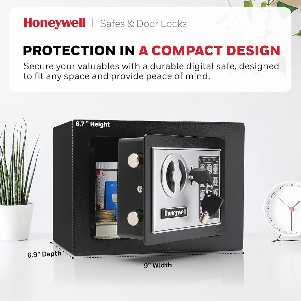 This Honeywell steel security safe with depository slot features a 0.17 cubic feet storage capacity and a programmable digital lock. There is also a scratch resistant powder coat finish and carpeted floor to help protect all of your valuables from being scratched or damaged. The black safe also has two solid steel door bolts, pry resistant concealed hinges and a recessed door all for added security. The black steel safe also provides override key access in case of emergencies and pre-drilled mounting holes and hardware are included with this safe. The exterior dimensions are 6.7 in H x 9.0 in W x 6.9 in D. And the interior dimensions are 6.5 in H x 8.9 in W x 5.1 in D. This safe weighs 6.5 lbs. LH Licensed Products, Inc. leverages premium consumer brand power to deliver innovative solutions for unmet and emerging consumer needs around the world. Our products are currently available in over 70 countries across the globe. LH Licensed Products, Inc. is the exclusive licensee and manufacturer of Honeywell Safes, Paper Shredders and Door Locks. Our partner company, Lewis Hyman Inc. began in 1930 as a family window treatment business in New York City. Widely recognized for lifestyle product innovation, Lewis Hyman Inc. has established a tradition of quality and service, spanning three generations and over eighty years of expertise. Use your gift card and search our other amazing products at our storefront - s://./Honeywell/pages/2529571011