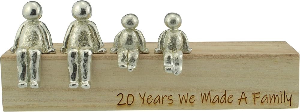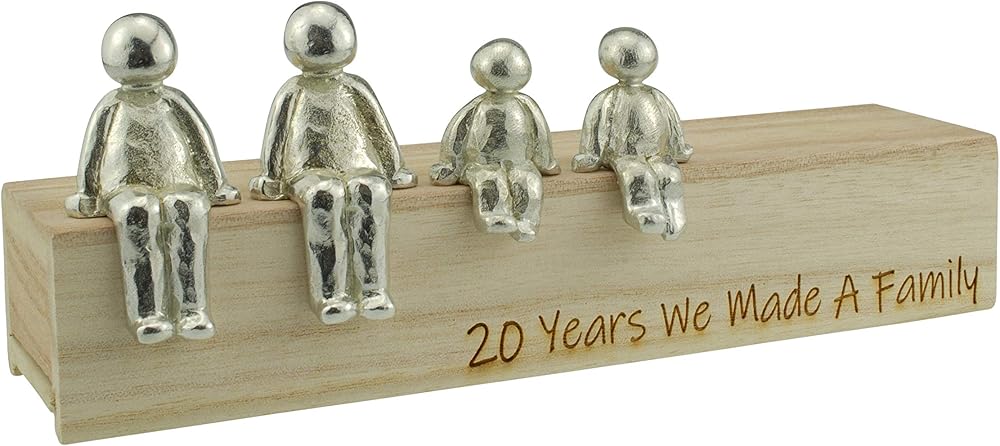 We are very excited to introduce our we made a family range for your 20th wedding anniversary gift idea to give for a couple or husband or wife. With solid metal characters to your own family combination these little people not only look cute but add a really great personal touch for your 20 year. After 20 years together you should be proud of the family you have made and you can display it here right in your living room. These cute little people are genderless so can represent any combination your like and are made from solid metal, for the 20th anniversary they are made from solid metal. Not only do they look great but flip the wooden packaging box over and it doubles as a great little shelf for your family to sit on laser engraved for your 20 year anniversary.