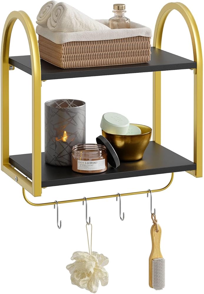 Bestier Black Floating Shelves for Wall, 2 Tier Black Shelves for Room Wall Decor with Towel Bar and Hooks, Gold Floating Shelves for Kitchen, Living Room, Bedroom, Bathroom, Classic Black