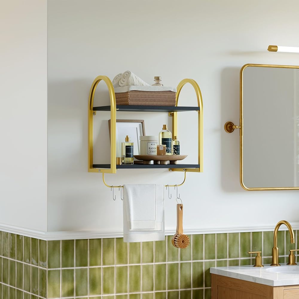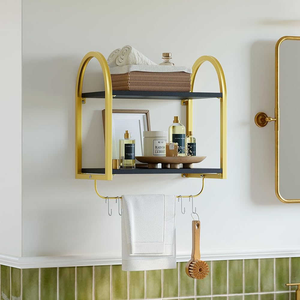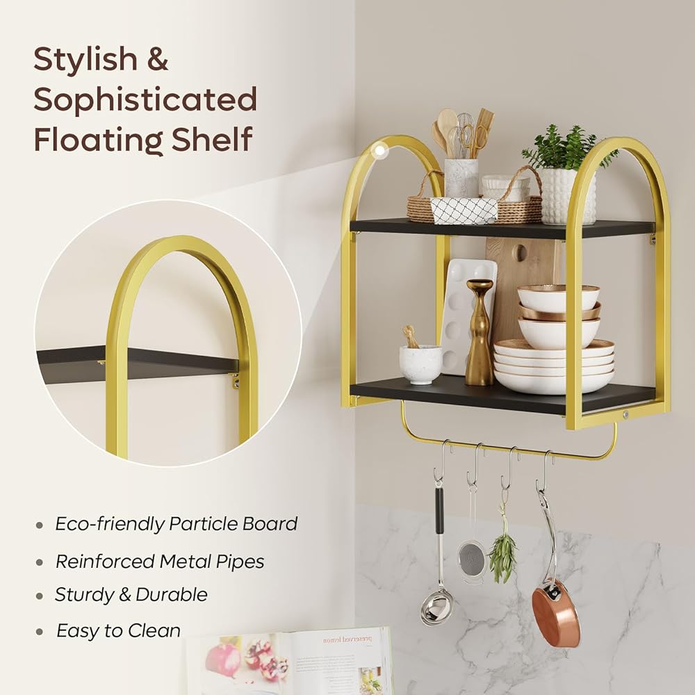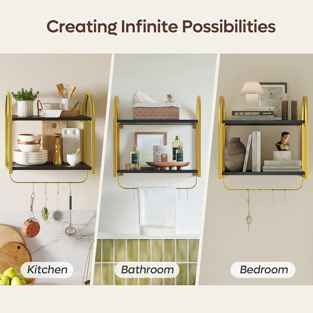 [2 Tier Shelves with Towel Bar & Hooks] - Infuse charm with this versatile gold metal shelving rack into your space, featuring four hooks and a towel bar for convenient storage. Ideal for kitchen supplies, towels, and mugs, the wall shelves add a touch of light luxury to any room.