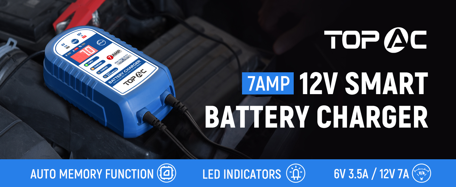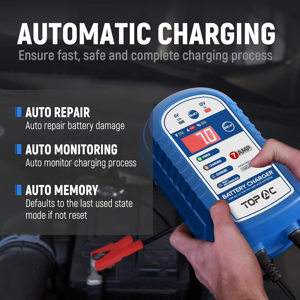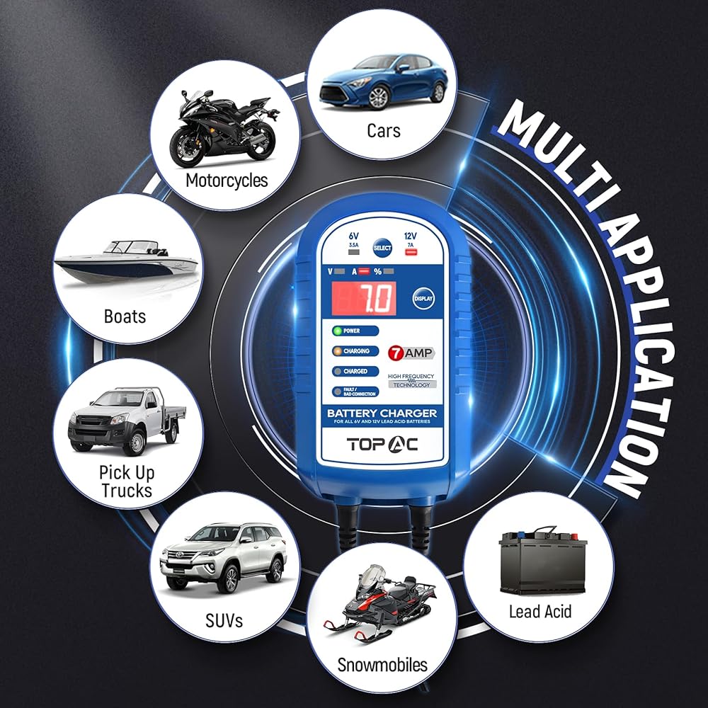 【Wide Application】12V/7Amp 6V/3.5Amp high power, intelligent car battery charger ideal for most of 12V and 6V lead-acid for motorcycles, cars, SUVs, pick up tracks, boats,lawn mowers, snowmobiles and more