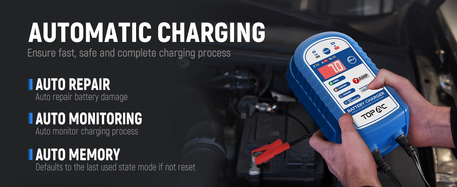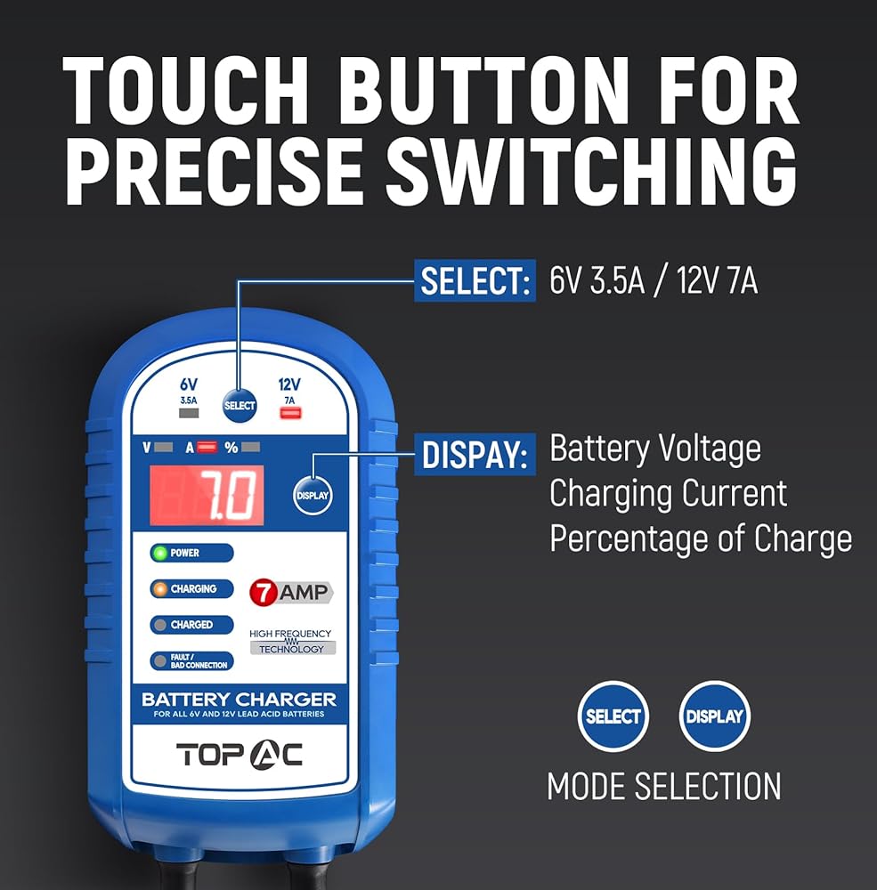 【Automatic Charging】 You can choose 12V/7A or 6V/3.5A, our charger will keep the batteries in the best conditions, automatically adjust the charge rate as battery becomes charged, and stop when the battery is fully charged.