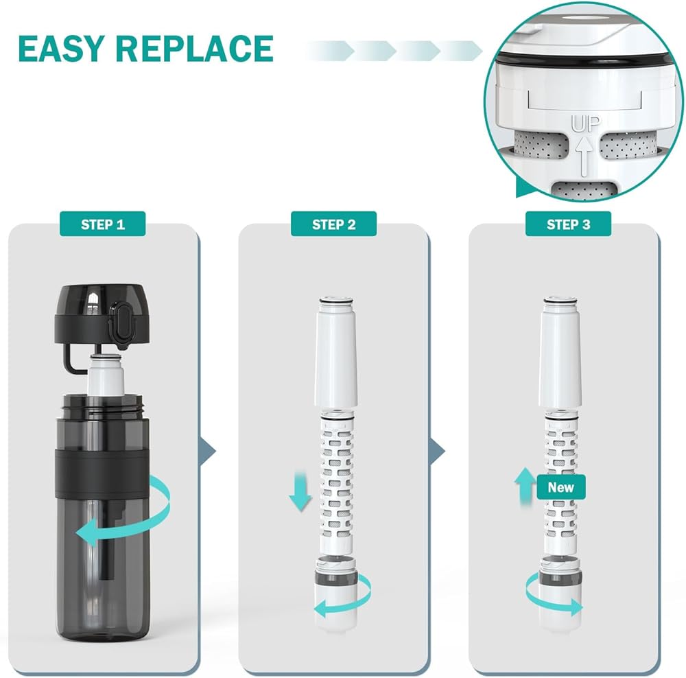 【SAVE MORE, WASTE LESS】Take this portable 17oz filtered water bottle with you on the go- For travel abroad, for hiking, for backpacking, for camping, for exercising or at home. You can enjoy pure water while on the go. Say goodbye to the hassle of frequent store visits and carrying disposable plastic bottles. We help you eliminate the use of 3,000 single-use plastic bottles in a year! Not only does it improve the taste, but also it saves you a significant amount of money!