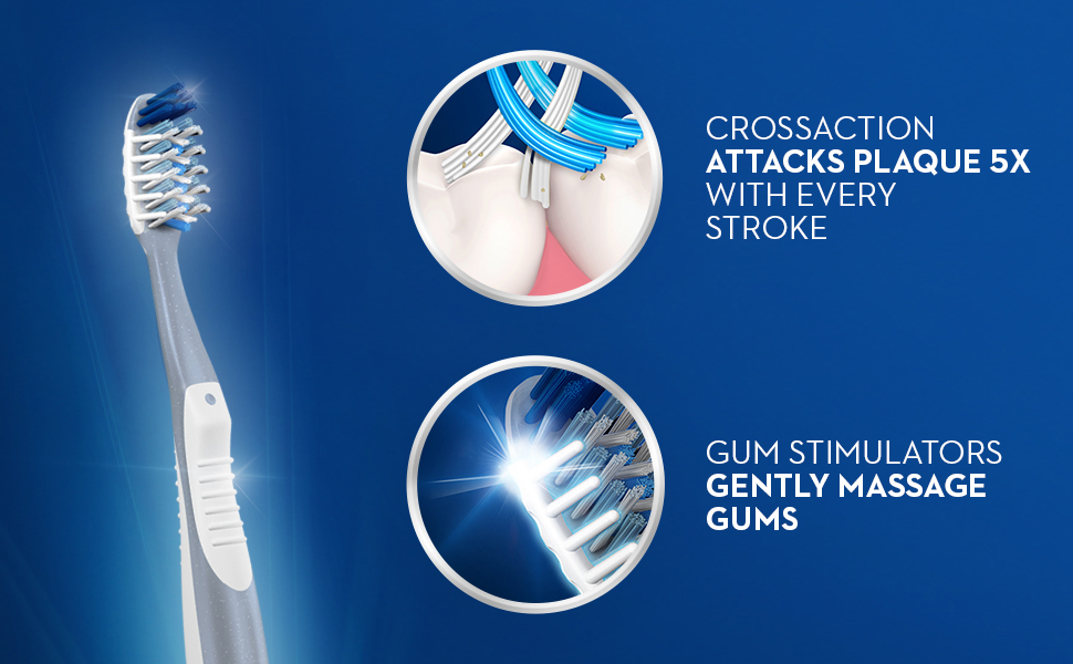 Unique CrossAction bristles are angled in opposing directions to lift out and sweep away plaque