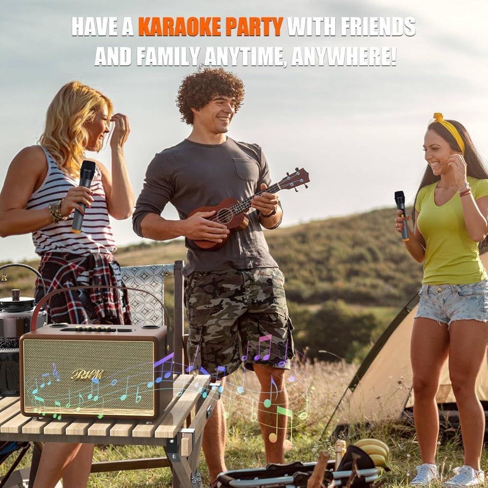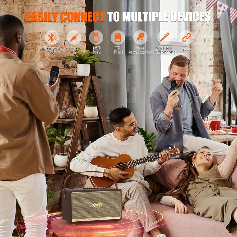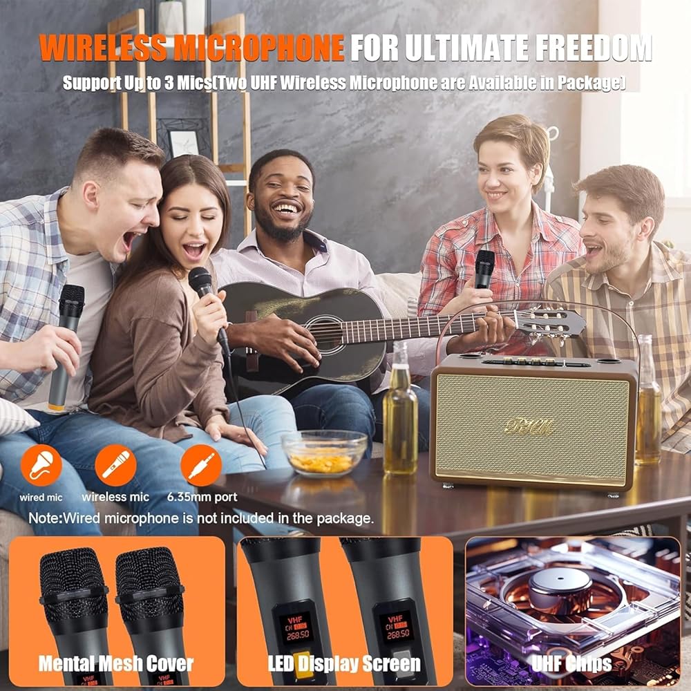 2 ميكروفون لاسلكي UHF يتضمن ميكروفونين لاسلكيين لكاريوكي منزلك. سيتصل مكبر الصوت والميكروفون تلقائيًا عند تشغيلهما. هناك 4 أوضاع للمشهد بما في ذلك الوضع الأصلي ووضع المرافقة ووضع كيه تي في ووضع الموسيقى، لجعل غناءك أكثر متعة. يسمح لك مقبس الميكروفون الإضافي المدمج بتوصيل ميكروفون أو جيتار إضافي للاستمتاع بمزيد من المرح مع عائلتك.