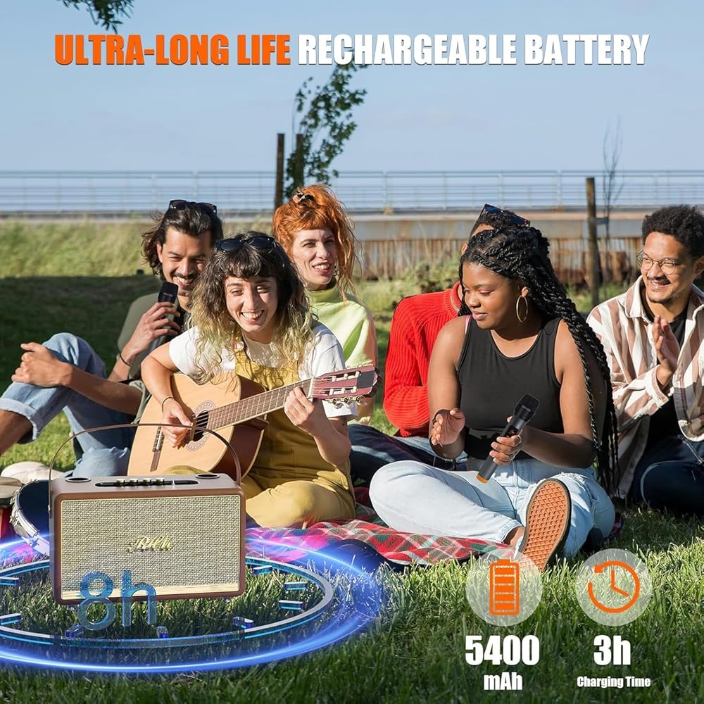 مكبر صوت خارجي محمول وقابل لإعادة الشحن ببطارية مدمجة قابلة لإعادة الشحن بسعة كبيرة 2 × 4000 ميلي امبير في الساعة، يمكن استخدام الشحن الكامل لمدة 6-8 ساعات، إذا كنت ترغب في استخدامه لفترة أطول، يمكنك الحفاظ على الطاقة باستمرار (يدعم الشحن أثناء الموسيقى)، والاستمتاع بالموسيقى الجيدة. تصميم المقبض يجعل من السهل اصطحابه إلى أي مكان.