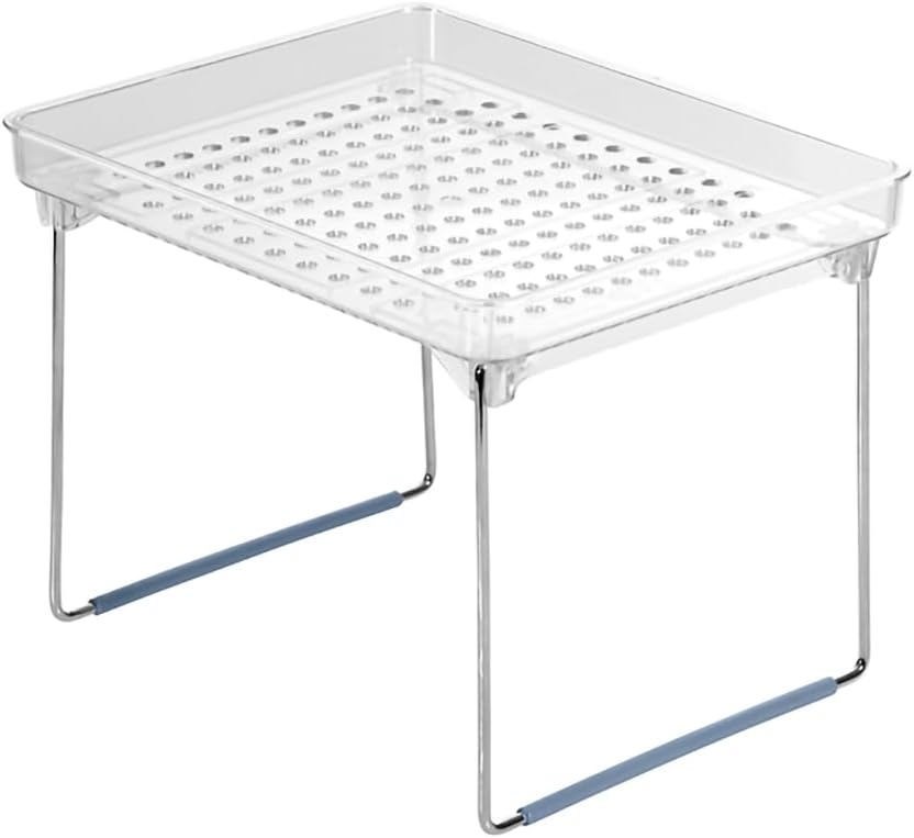 STAYS IN PLACE: Nonslip rubber feet prevent the shelf from sliding whether it's stacked or standing alone, and the soft-grip dots on the surface keep your items nearly in place