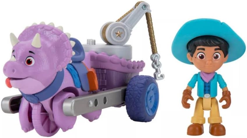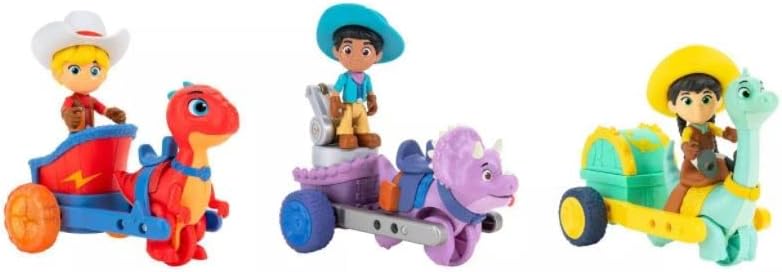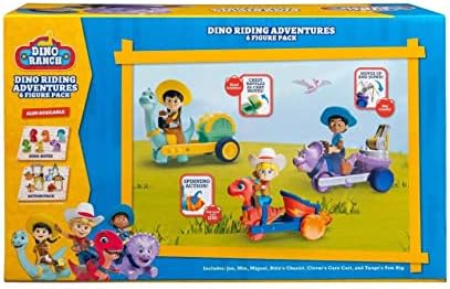 Howdy! Join Jon, Min, & Miguel with the Dino Ranch Dino Riding Adventures, a 6 Figure Pack! The Target Exclusive features three dino vehicles and three figures. There are a total of three styles that come with the pack: Jon & Blitz, Min & Clover, and Miguel & Tango. Each vehicle has a built-in dino and comes with a Dino Rancher figure.