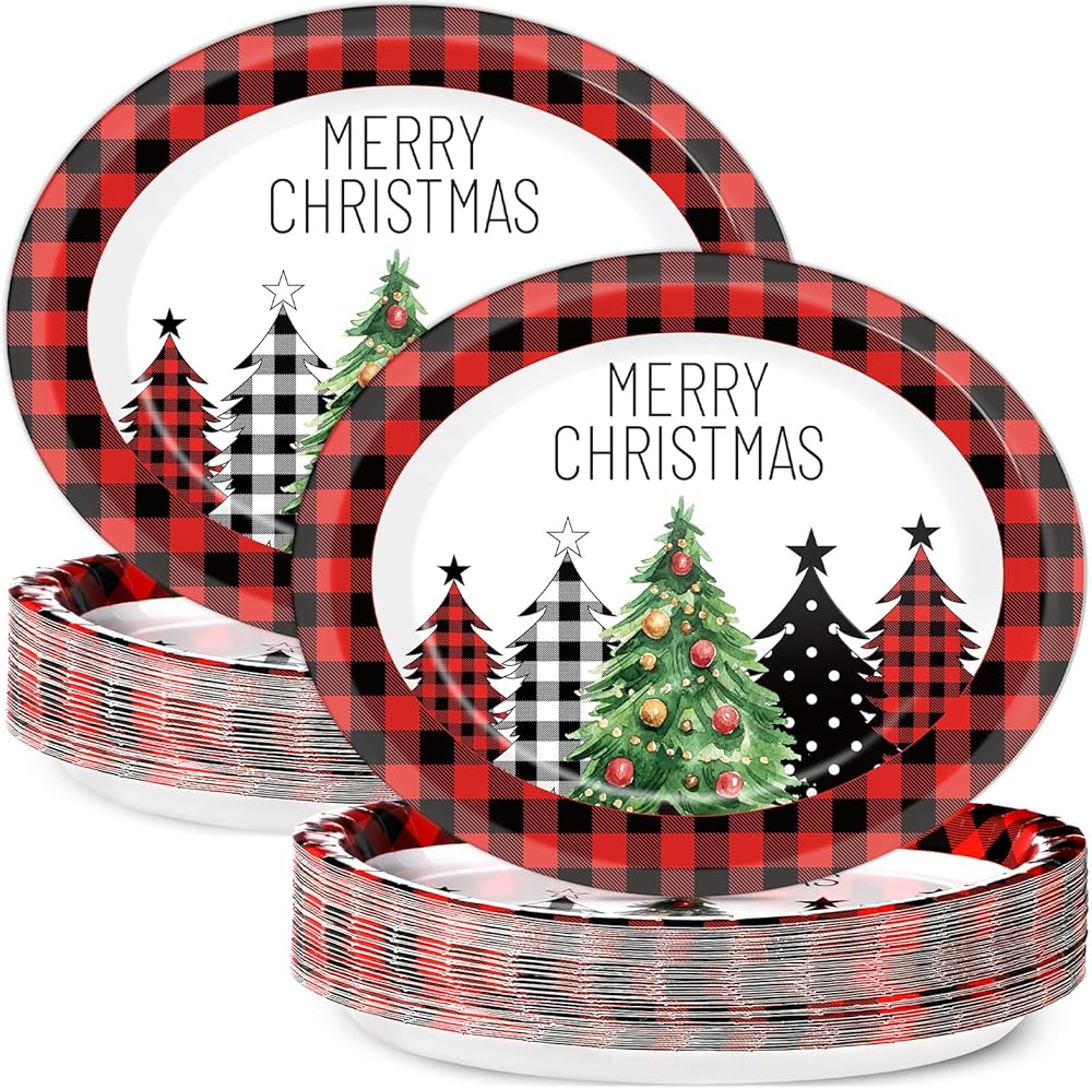 50Pcs Christmas Buffalo Plaid Tree Oval Plates 11 Inch Red and Black Gingham Party Supplies Merry Christmas Disposable Dinnerware Plates Xmas Serving Tray for Winter Holiday Party Supplies Decorations