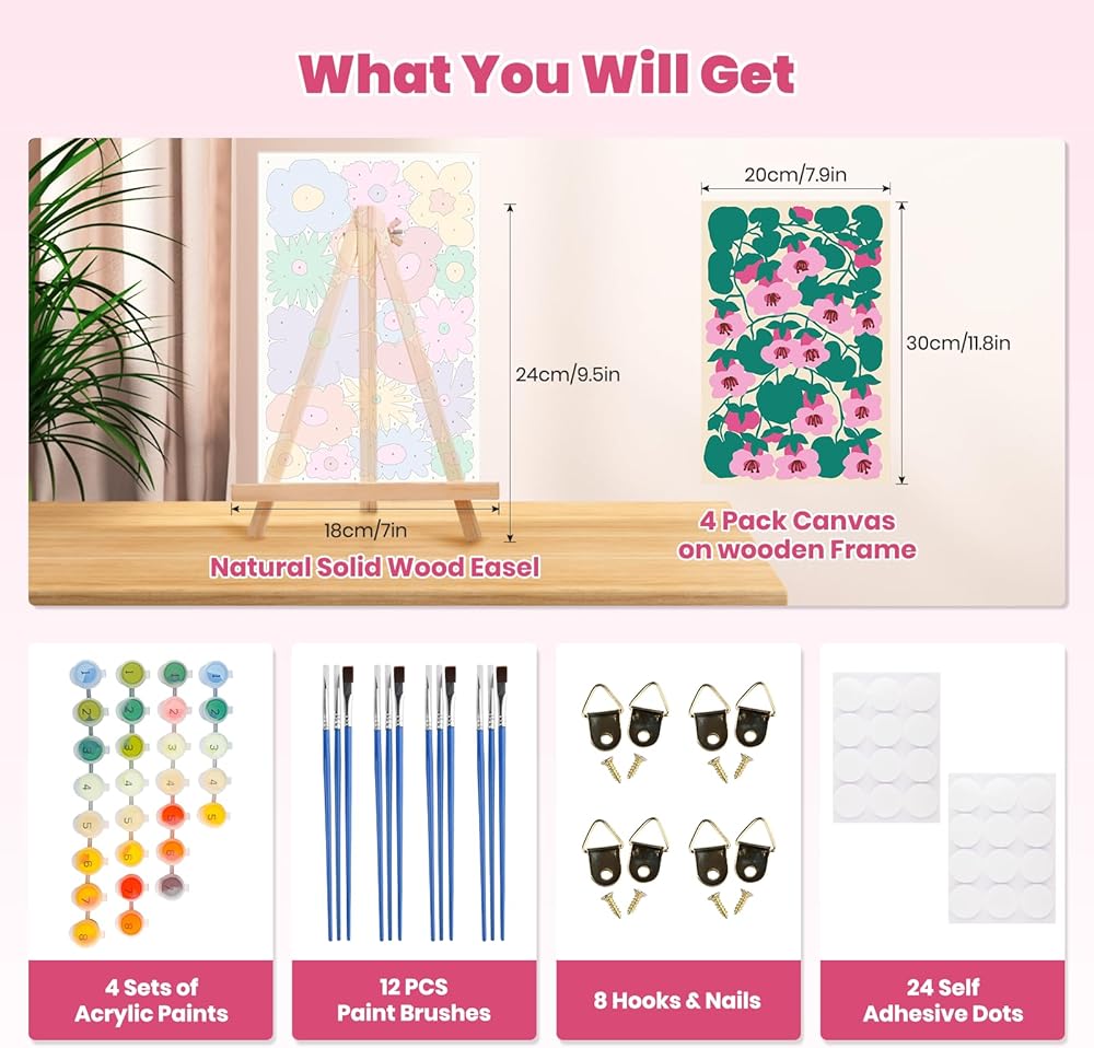 【What You Will Get】Paint by numbers for adults frame canvas with wooden easel, flower diy oil painting pattern. 4 pack pre-printed textured art canvas on frame(size:8” x 12”), 1 pcs wooden easel, 4 set of high-quality acrylic paint, 12 pcs paint by numbers brushes, a manual, 8 hook nails and 24 self adhesive dots. You can hang your masterpiece on the wall for display.