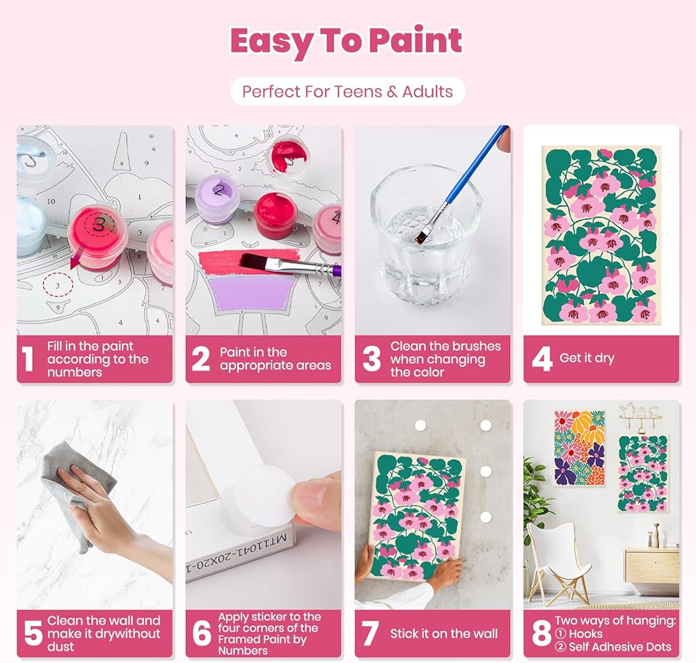【Framed Canvas without Creases】Unlike other folded or rolled canvases, the framed paint by numbers kit we offer don't need to be ironed and can be hung directly on the wall as decorative paintings when finished. Our paint by number canvas uses high-definition color canvas and healthy acrylic paints. The number area is easier to distinguish, and paint is easier to adhere to it. Colored canvas can prevent eyestrain and make painting easier.