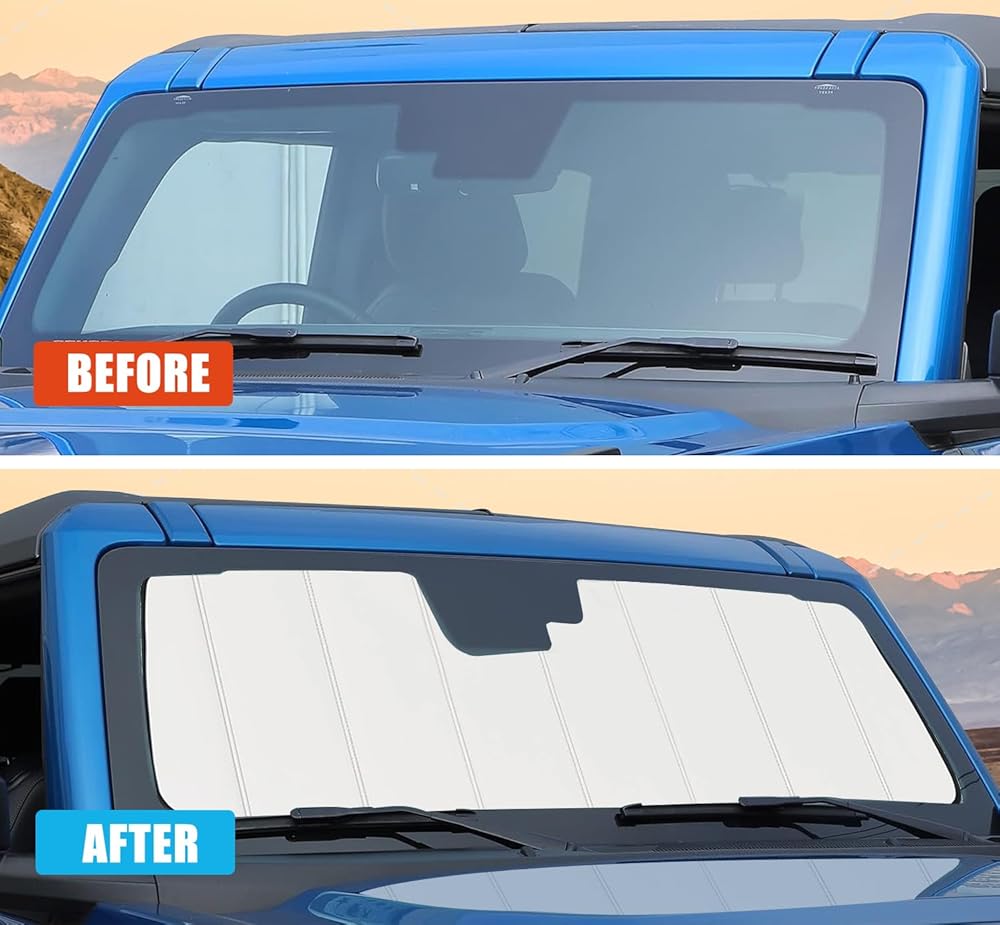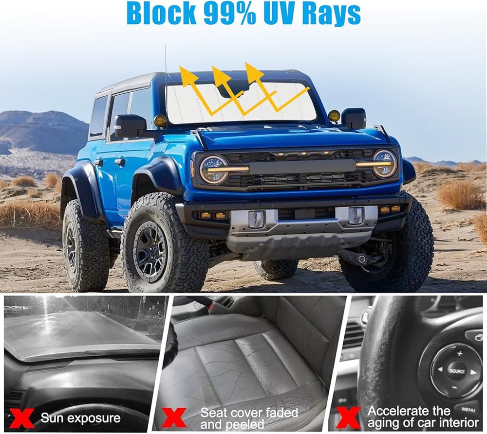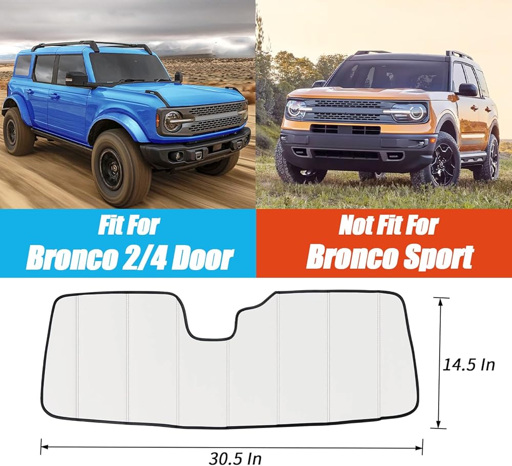 𝐅𝐈𝐓𝐌𝐄𝐍𝐓-The Windshield Sun Shade is perfectly compatible with Ford Bronco 2/4 Door 2021 2022 2023 2024, not fit for Bronco Sport.