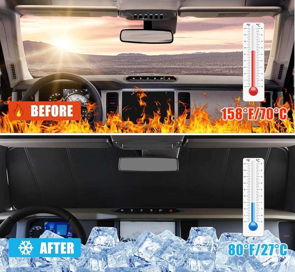 𝐅𝐔𝐍𝐂𝐓𝐈𝐎𝐍-The sunshade will protects your vehicle's interior, dashboard, seats and electronics from harmful UV damage, Preventing fading, cracking and emitting unpleasant odor caused by prolonged exposure to sunlight