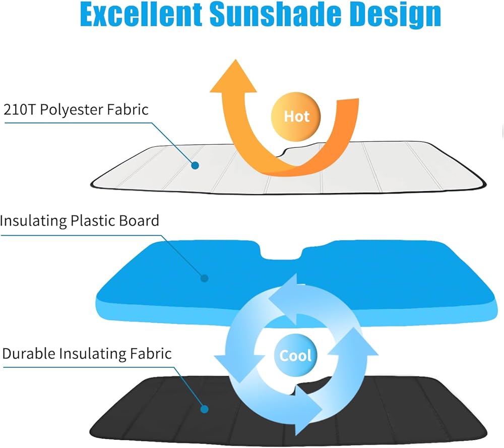 𝐌𝐀𝐓𝐄𝐑𝐈𝐀𝐋-The sunshade is made of high-grade 210T polyester fabric with a three-layer structure design. The black & blue insulation layer and silver reflective layer provide strong and effective heat insulation protection, blocking 99% of harmful ultraviolet rays and heat accumulation.