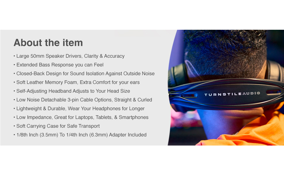 محتويات العلبة: سماعات رأس Turnstile Audio TAPH700 الاحترافية لمراقبة الاستوديو | محول 1/8 بوصة (3.5 مم) إلى 1/4 بوصة (6.3 مم)، كابلات مجعدة ومستقيمة قابلة للفصل بطول 9 أقدام و3 سنون | حقيبة حمل ناعمة لسهولة تخزين المعدات | ضمان محدود لمدة عامين على نظام Turnstile Audio