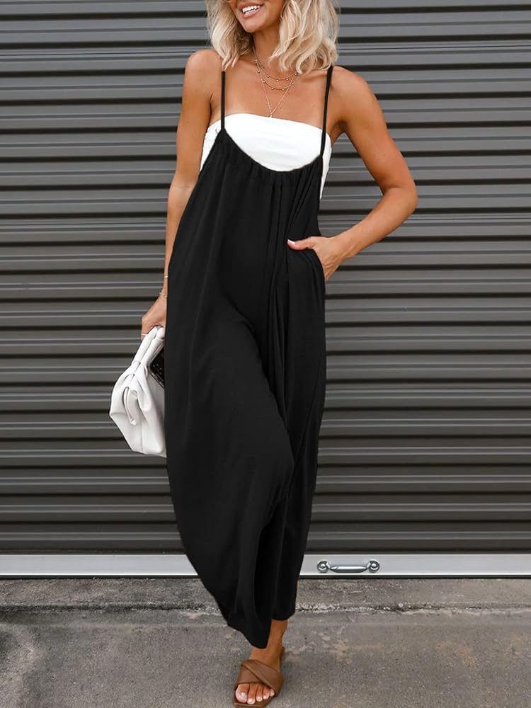 ❤ Feature -Stretchable Long Pants Jumpsuit,sleeveless with spaghetti strap, 2 Inserting Pockets on the Front. Loose Fit, Casual Style.
