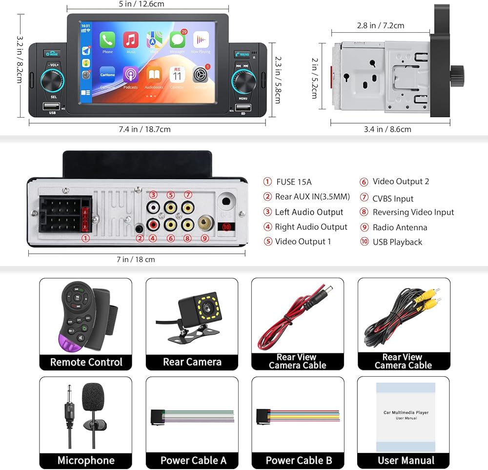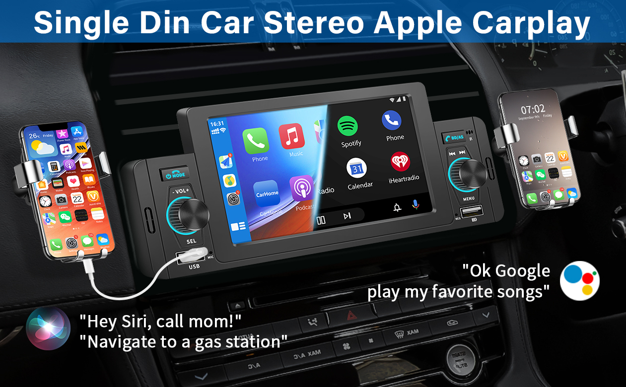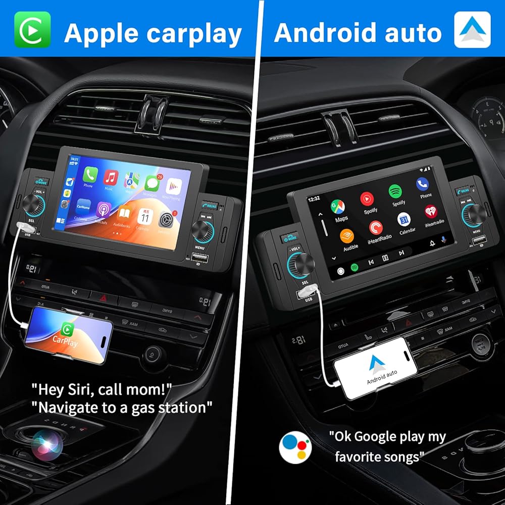5 Inch Single Din Car Stereo with Apple Carplay/Android Auto,Single Din Carplay Touchscreen Car Stereo with Mirror Link Support Backup Camera/Bluetooth Handsfree/FM/AUX/TF/USB/EQ