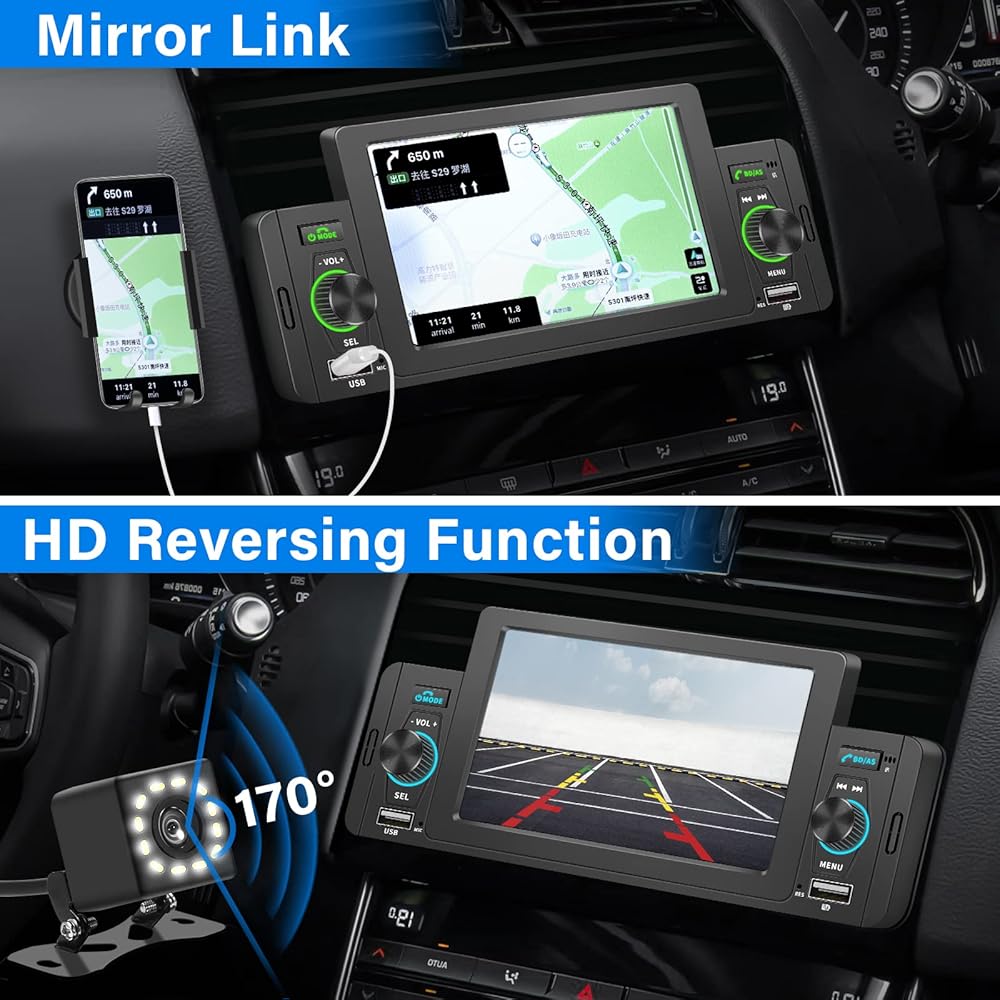 【Rear view Camera】5 inch HD touch screen responsive, enjoy the large screen navigation map, not afraid to take the wrong way. Support rear-view camera input (including rear-view camera). Switch automatically when reversing, the image is displayed perfectly on the screen, and the connected rear-view camera can help you park safely.