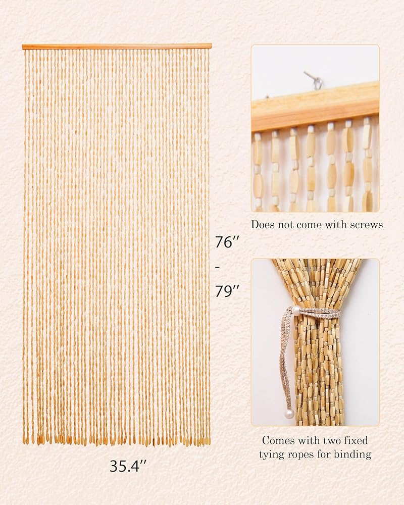 NATURAL BEAUTY: Ezcasch bamboo beaded curtains are handmade using virgin materials, ensuring a natural and non-hazardous product. The 35.4"x79" size is carefully crafted for durability, with each piece featuring a unique color and length due to its handmade process.