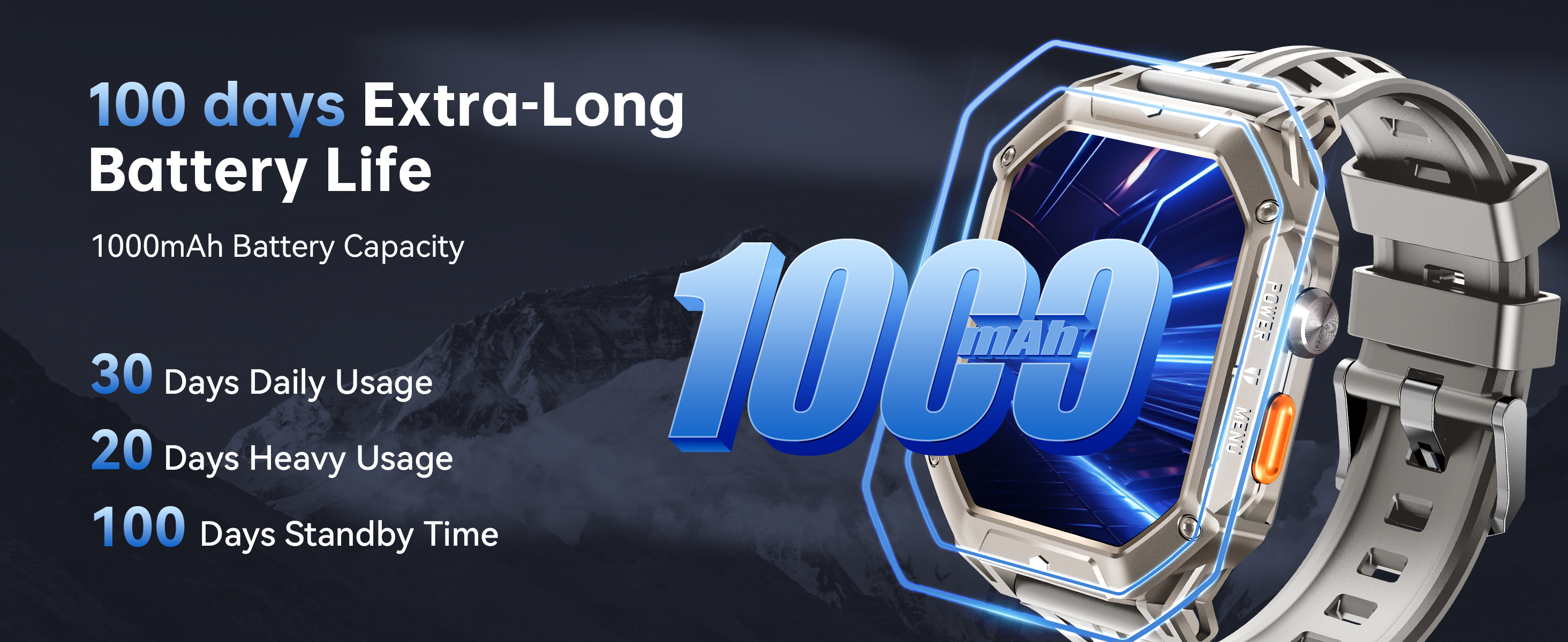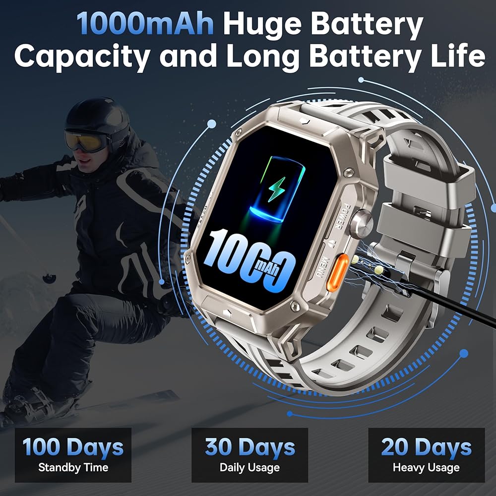 【Up to 100 Days Battery】:This military smart watch has a powerful 1000mAh battery capacity, which provides up to 25 days of uptime, and up to 100 days of battery life when you continue to use the sports mode, health check and other functions with the power saving mode on. Without a doubt, it will be your best companion for short-distance outdoor activities and adventures.