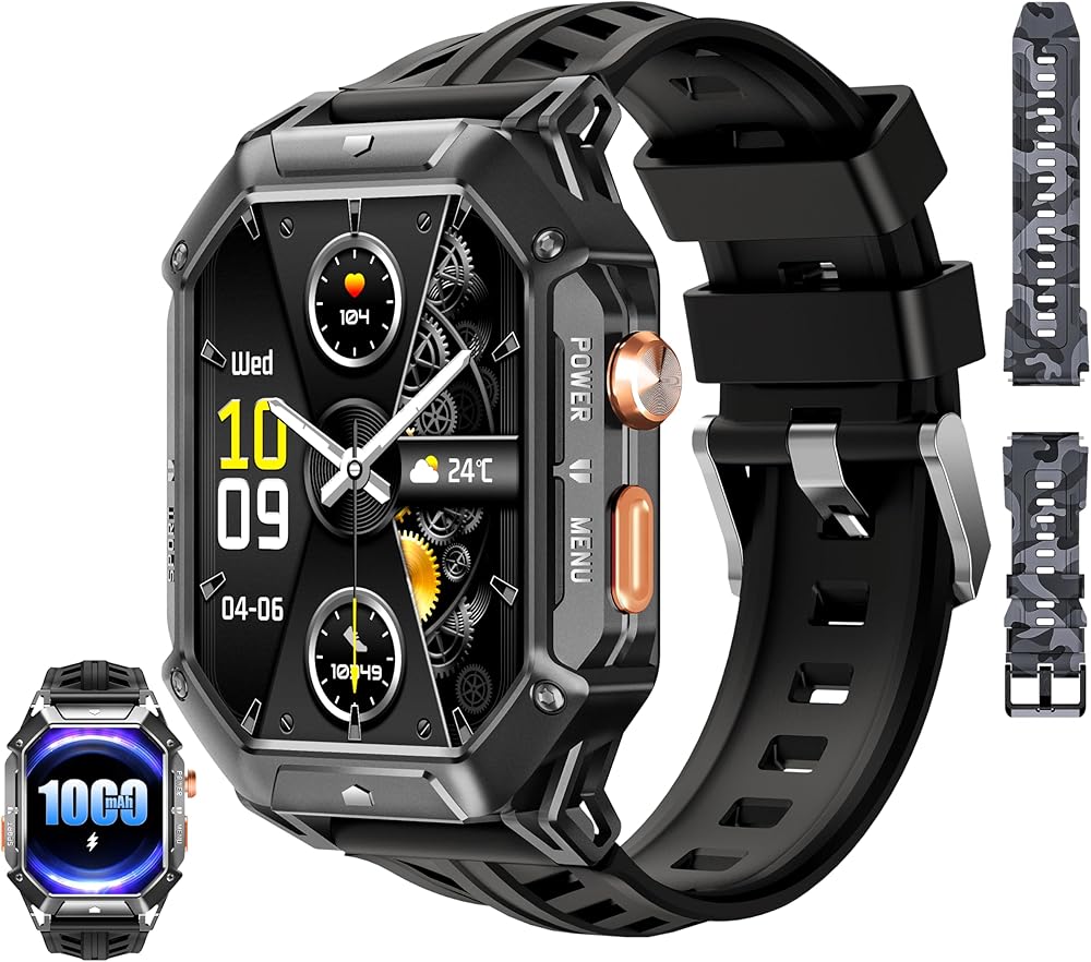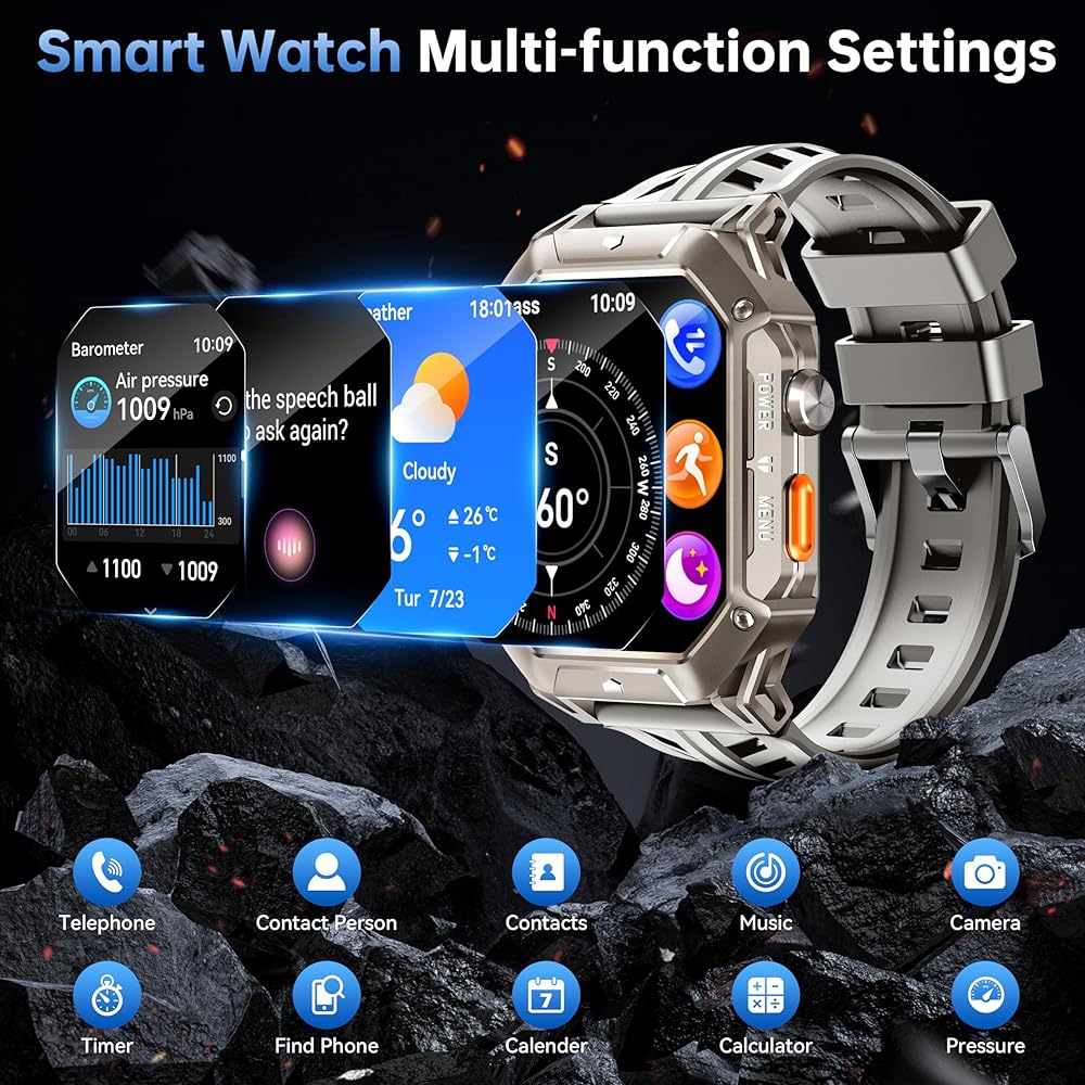 【Military Standard Quality】-It has passed 12 outstanding certifications: anti-shock, extreme temperature, IP68 waterproof (50 meters waterproof), dustproof, anti-scratch, impact and other tests, which can withstand harsh environments, this men's smartwatch is designed for outdoor enthusiasts.