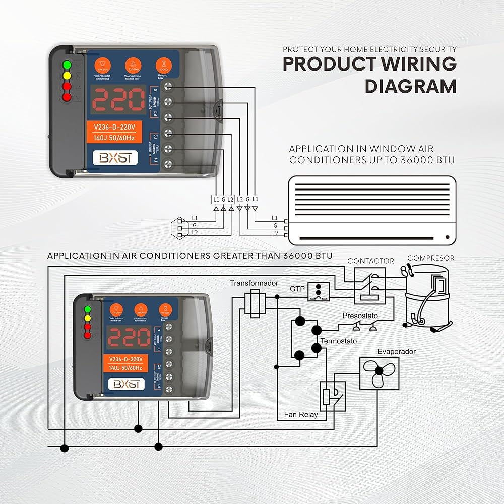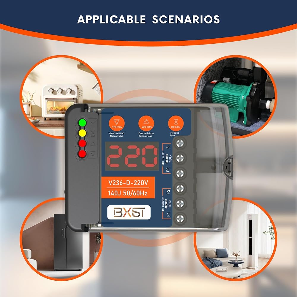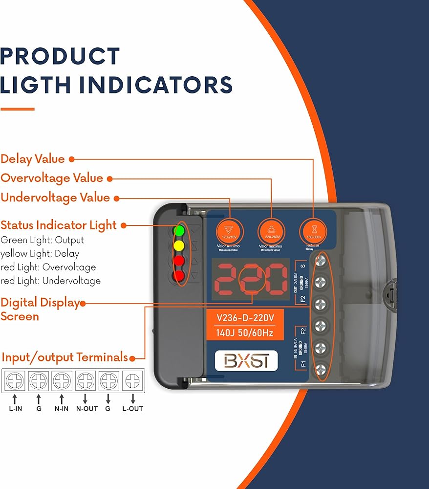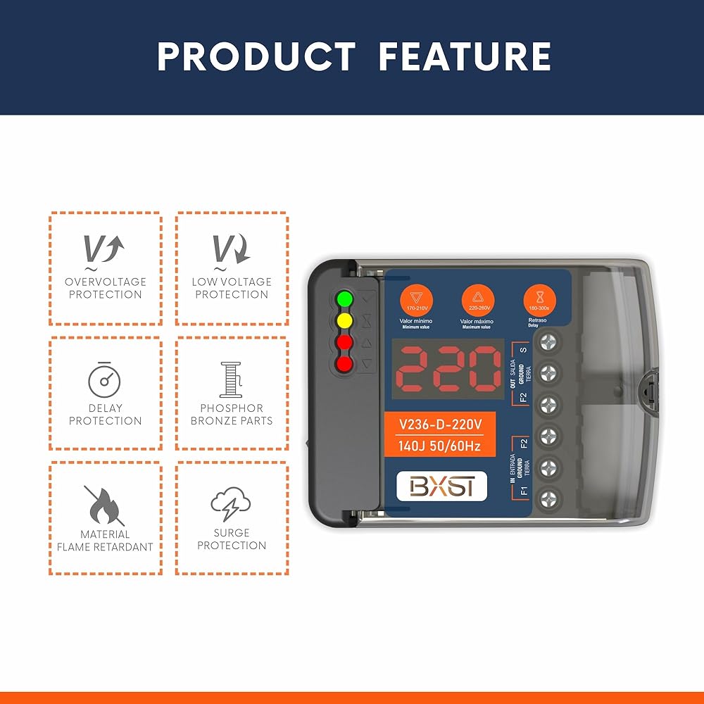 📋Product specifications:Work voltage:220V Frequency:50/60Hz Current:20A Delay time:180-300S(adju) Under voltage: 170-210V(adju) Over voltage: 220-260V (adju) Joule:140J