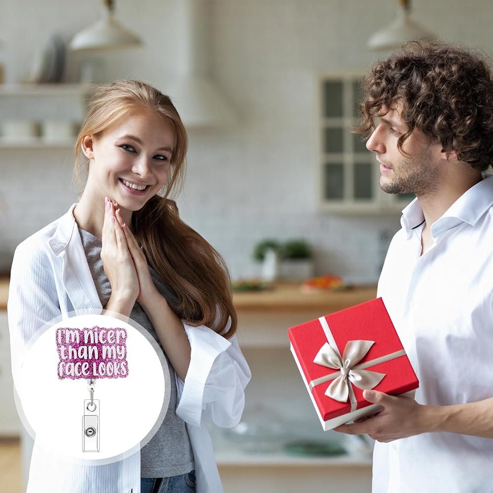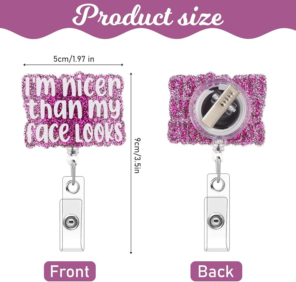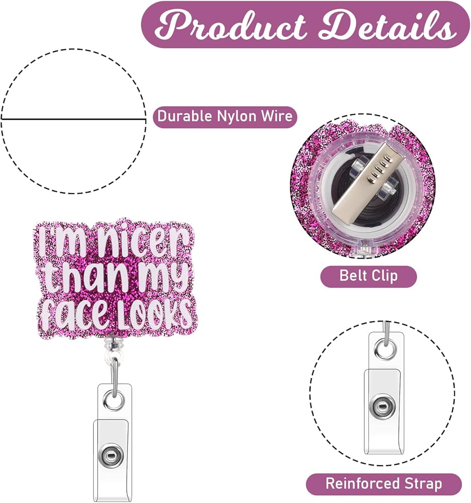 Funny Nurse Badge Reel, I'm Nicer Than My Face Looks Badge Holder Retractable Cute Badge Reels for Nurses Nursing Badge Clips Cool ID Tag Card Holder Clips for Doctor Student Office (Pink)