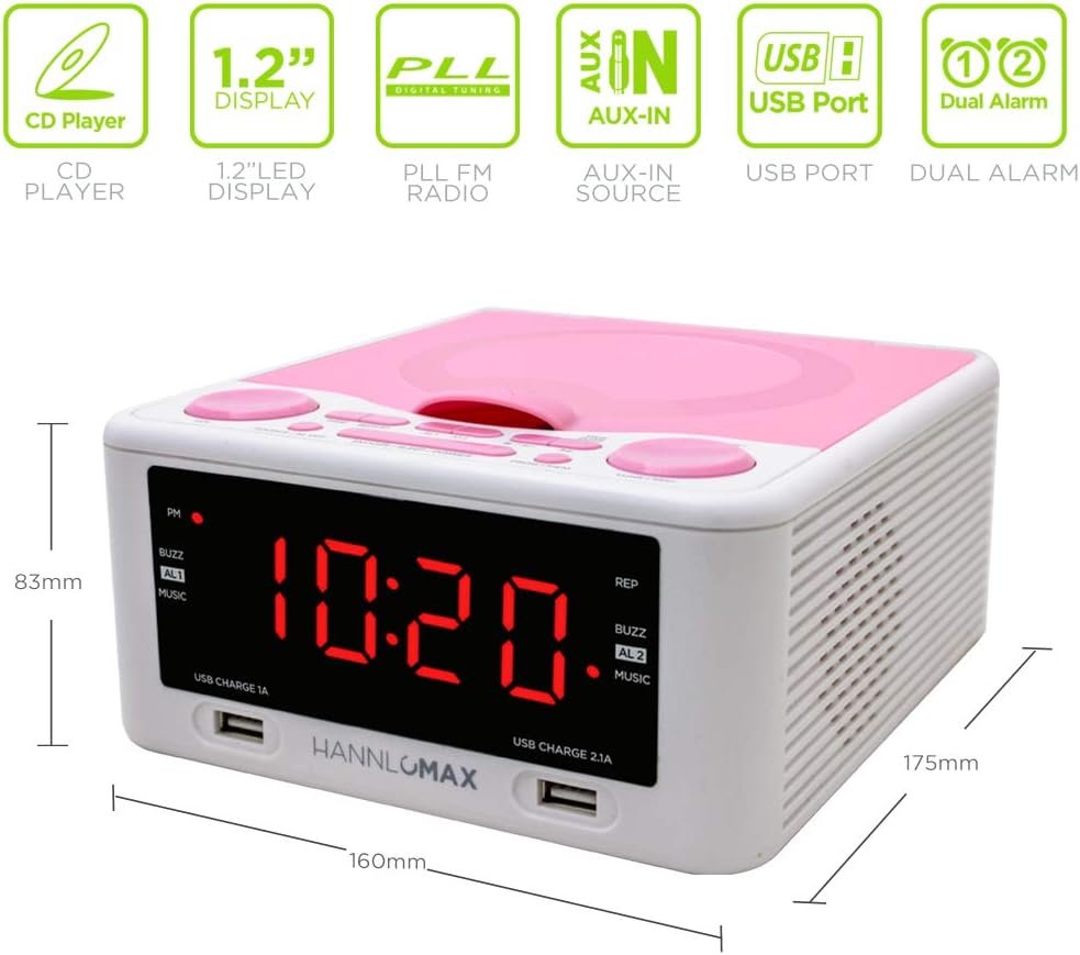HX-300CD is Dual Alarm Clock Radio with CD player and dual USB charging. It has a 1.2” red clear LED display. The big-sized buttons are easy to read and set. With the dimmer control, you can adjust the brightness of the display according to your favourite. The PLL radio tuning system can be preset, with your favorite radio station loud and clear. The programmable Sleep Timer allows you to fall asleep to the radio. Dual alarm setting (wake to CD, radio or buzzer) is easy and the alarms are independent, so both bed-mates need only this one alarm clock. The dual USB Ports (2.1A and 1A) enables you to charge your smartphone or other smart devices with fast speed. You can enjoy good stereo sound quality from then CD playback with programmable functions.