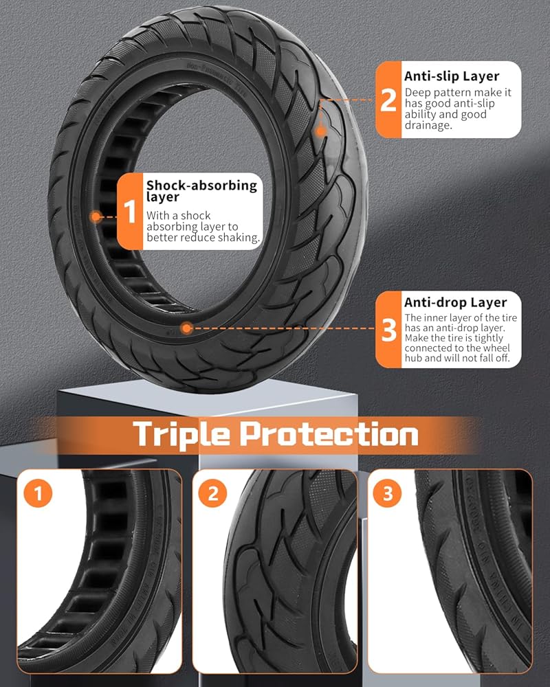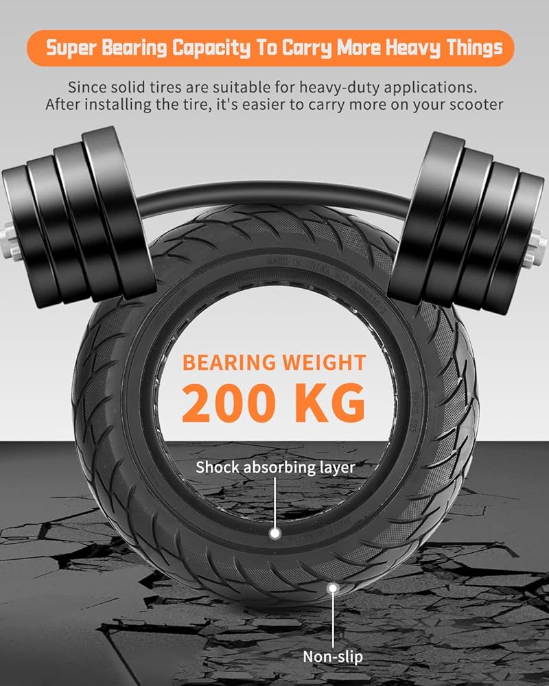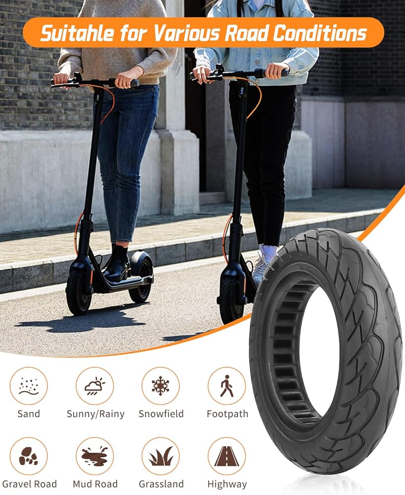 Honeycomb Tire Design:This 10-inch scooter tire is more resilient to uneven roads, such as grass roads. The interior of the tire is designed with honeycomb holes, which can increase the damping effect by 35% and effectively ease the bumps on the road.Solid tire service and quality in the market is very popular. If the solid tire has any quality problems, welcome 24hs contact us at any time.