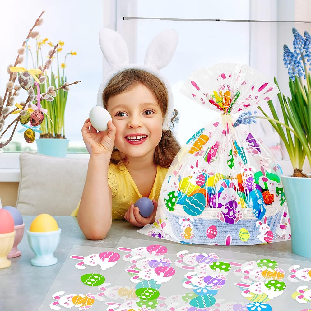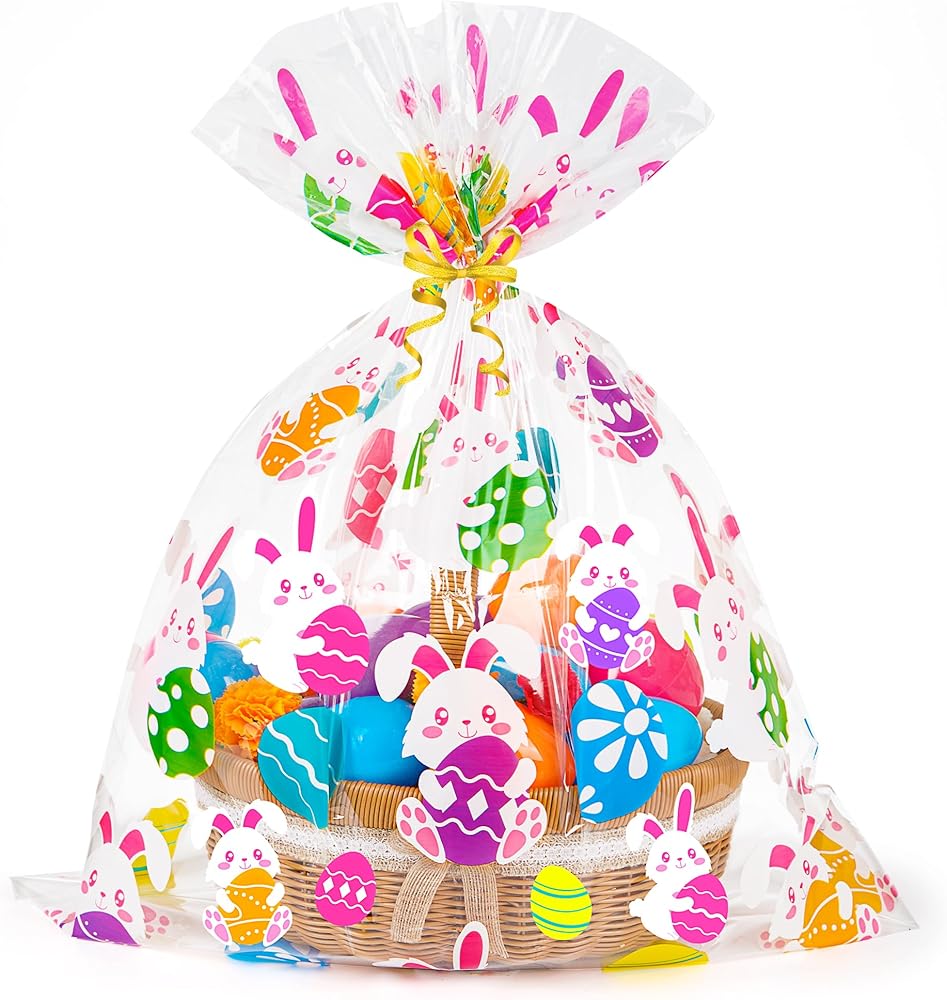 LARGE EASTER BAGS:Our easter gift bags set includes 10pcs 24x30 inch extra large cellophane bags for gift wrap.Selected size for gifts,party favors and gift baskets of various sizes.Perfect for wrapping easter baskets with festive colorful easter eggs design and large size.