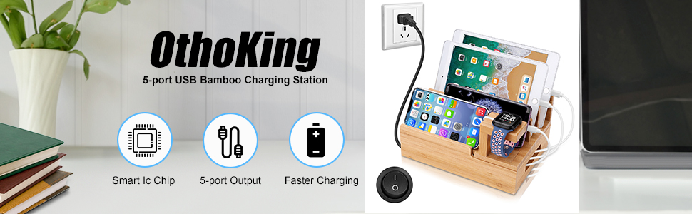 What You Get: OTHOKING 5-port Bamboo Charging Station, user guide, power charger, (Note:short USB cables not included) and Any question please feel free to contact us.