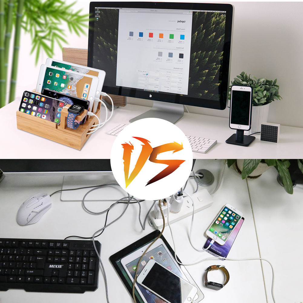 Tangled Cables Killer:This Charging Station Organizer keeps your desktop cables tidy and well-organized in the storage box, is able to charge up to 5 devices in one spot without much cable clutter, and no more wires around the house. Ideal Gift Choice.
