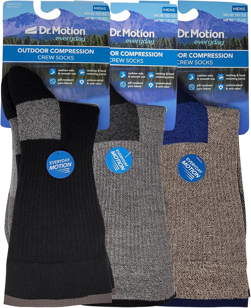 Dr. Motion Outdoor Compression Crew Socks provide superior all-day comfort with a special TruDry polyester blend that wicks away moisture. Perfect for outdoor activities, the heat-retaining acrylic and TruDry polyester blend is latex free, cruelty free, durable, and soft on the skin. Enjoy maximum comfort with 3 pairs of assorted half-cushion socks.