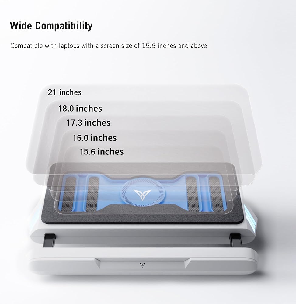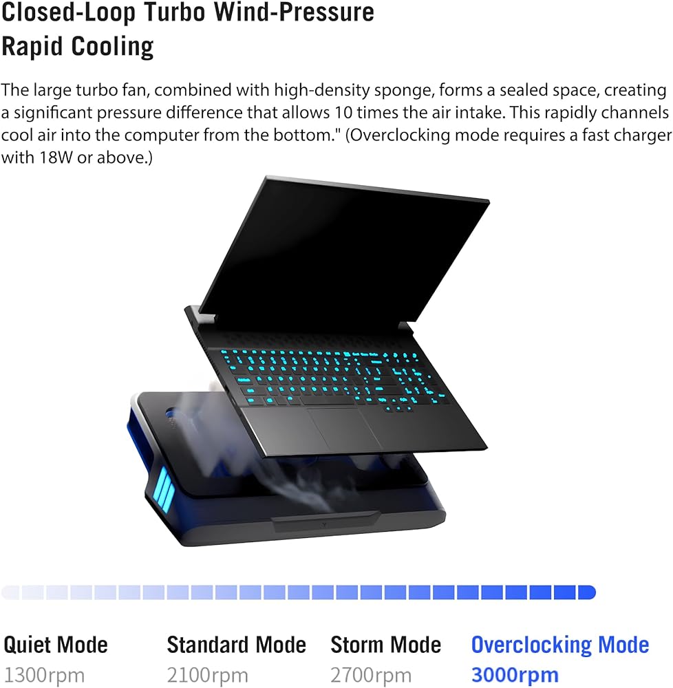 【Rapid Cooling & Wind-Pressure Closed-Loop Turbo-Fan】Wind-Pressure laptop cooler can cooling your laptop fastest and not hurt laptop at same time! The large turbo laptop fan, combined with high-density sponge, forms a sealed space, creating a significant pressure difference that allows 10 times the air intake. This rapidly channels cool air into the computer from the bottom." 4 modes: 3000rpm Overclocking Mode, 2700rpm Storm Mode, 2100rpm Standard Mode, 1300rpm Quiet Mode. (Overclocking mode requires a fast charger with 18W or above.)
