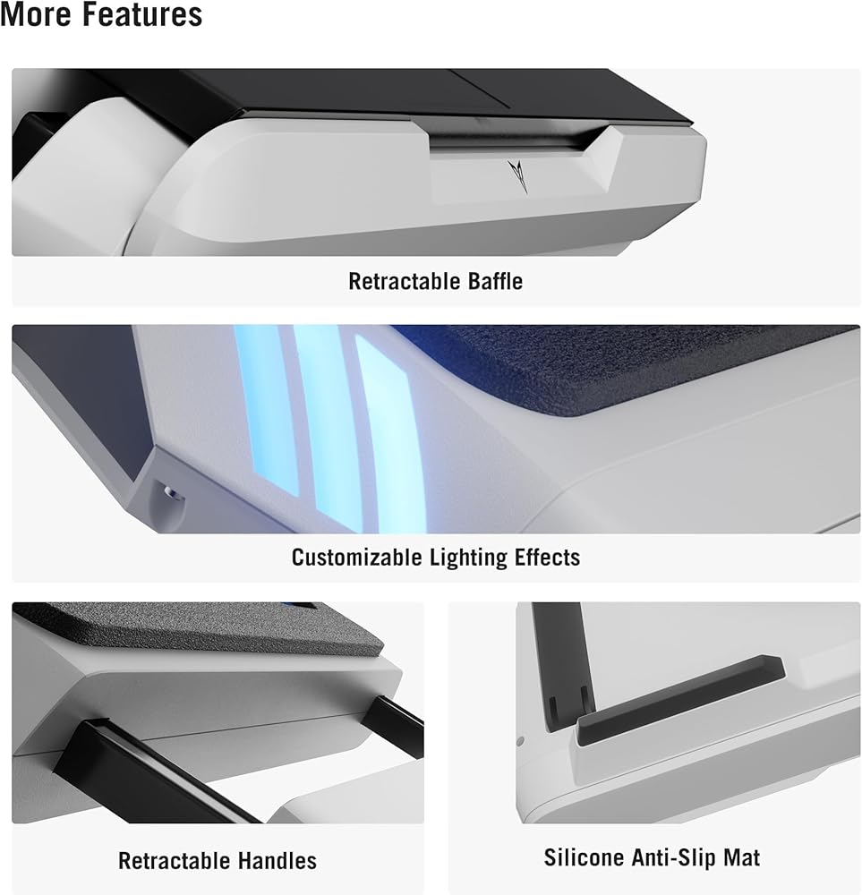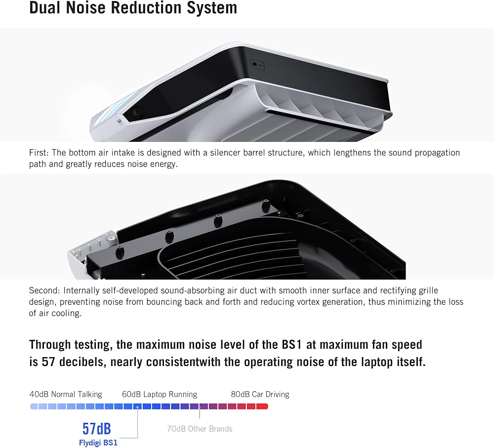 【Quiet Cooling & Dual Noise Reduction System】Keep away from fan noise now to enjoying game time! Through testing, the MAX noise level of the BS1 at MAX fan speed is 57 decibels, nearly consistent with the operating noise of the laptop itself. Firstly The bottom air intake is designed with a silencer barrel structure, which lengthens the sound propagation path and greatly reduces noise energy. Secondly Internally self-developed sound-absorbing air duct with smooth inner surface and rectifying grille design, preventing noise from bouncing back and forth and reducing vortex generation, thus minimizing the loss of air cooling.