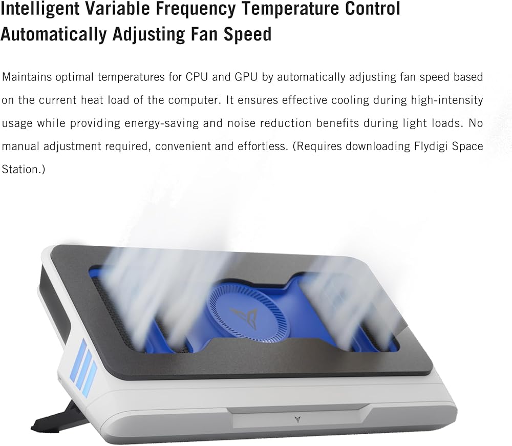 【Intelligent Variable Frequency Temperature Control】Keep playing your game and donot worry about too cold or too hot! BS1 laptop cooling stand can automatically adjusting fan speed (based on the current heat load of the laptop) to maintains optimal temperatures for CPU and GPU, which ensures effective cooling during high-intensity usage while providing energy-saving and noise reduction benefits during light loads. No manual adjustment required, convenient and effortless. (Requires download Flydigi Space Station)