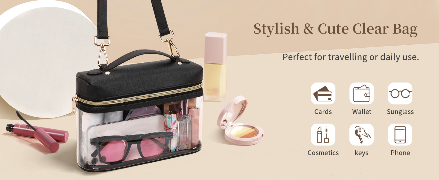 Multipurpose Clear Bag——Our clear purse is compact and lightweight, enough to hold phone, wallet, cosmetics, keys, cards, tickets, or small items. Suitable for various occasions, whether used for travel, work, sports, concerts, festivals, airports, or daily use. If you receive a wrinkled bag, you can lay it flat and it will gradually recover.Feel free to contact us for any questions.