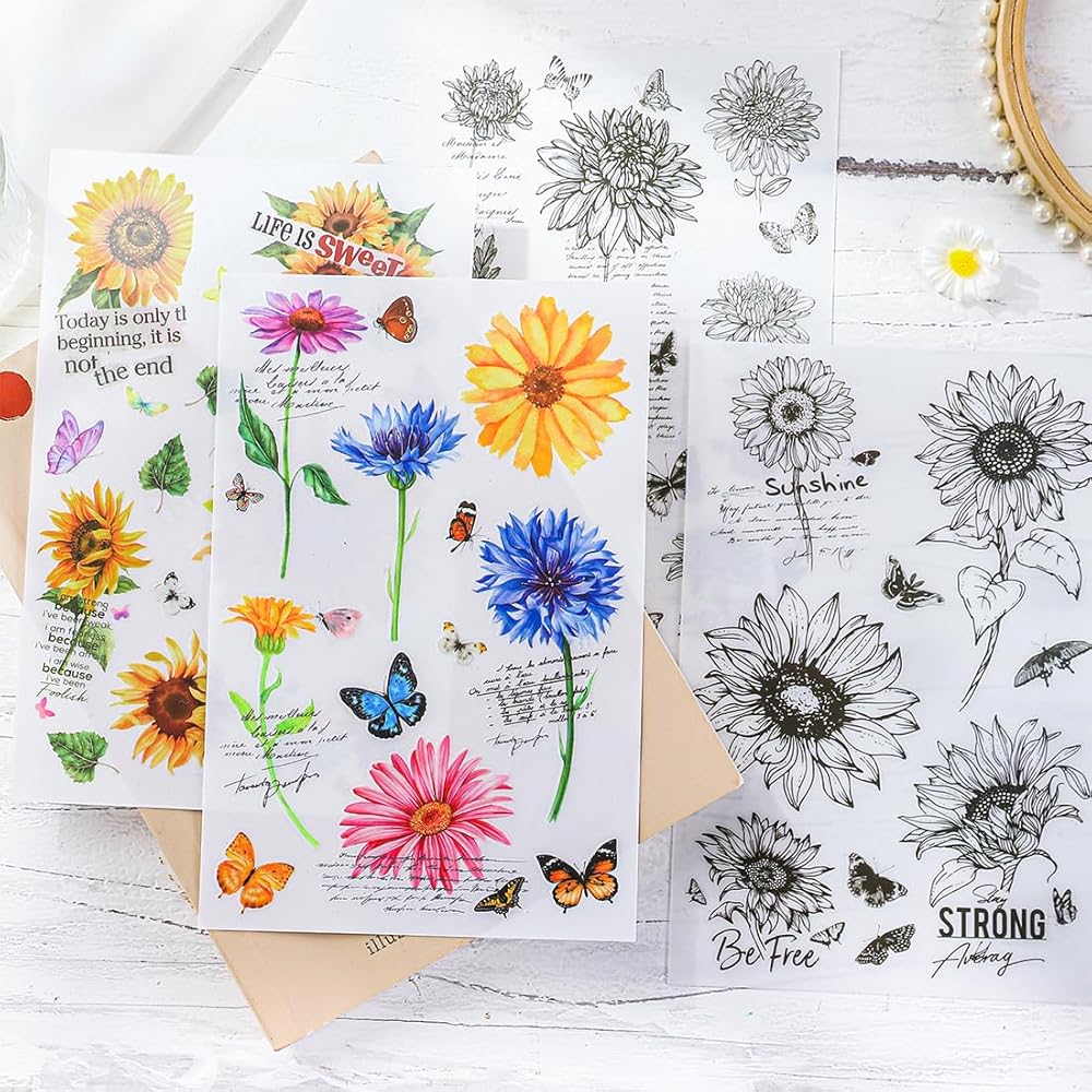 Design - Rub on transfers stickers scrapbook stickers come with 8 sheets rub on transfer florals leaves stickers includes 83pcs plant flowers transfer sticker , there are 4 style includes Rose, Chrysanthemums sticker, Sunflower, Bluebells, sticker come with red, yellow, blue and black white;