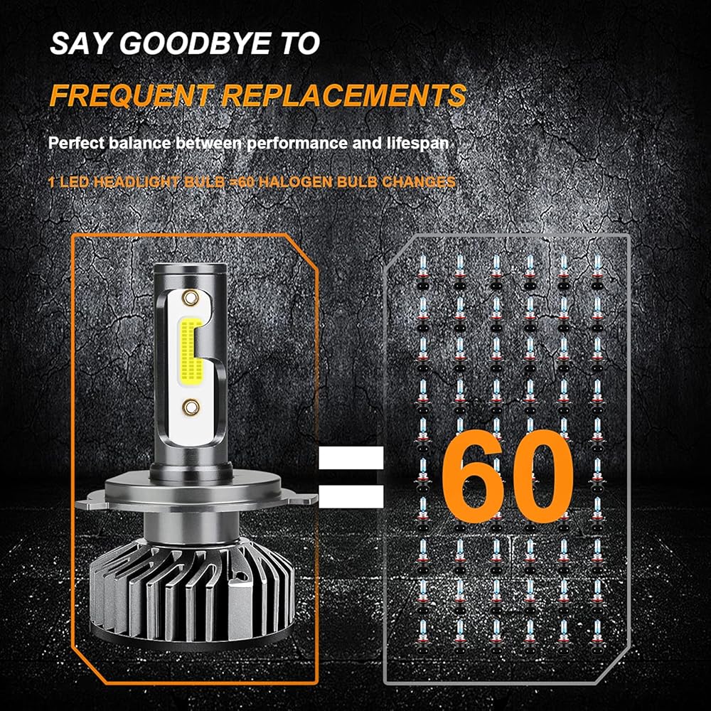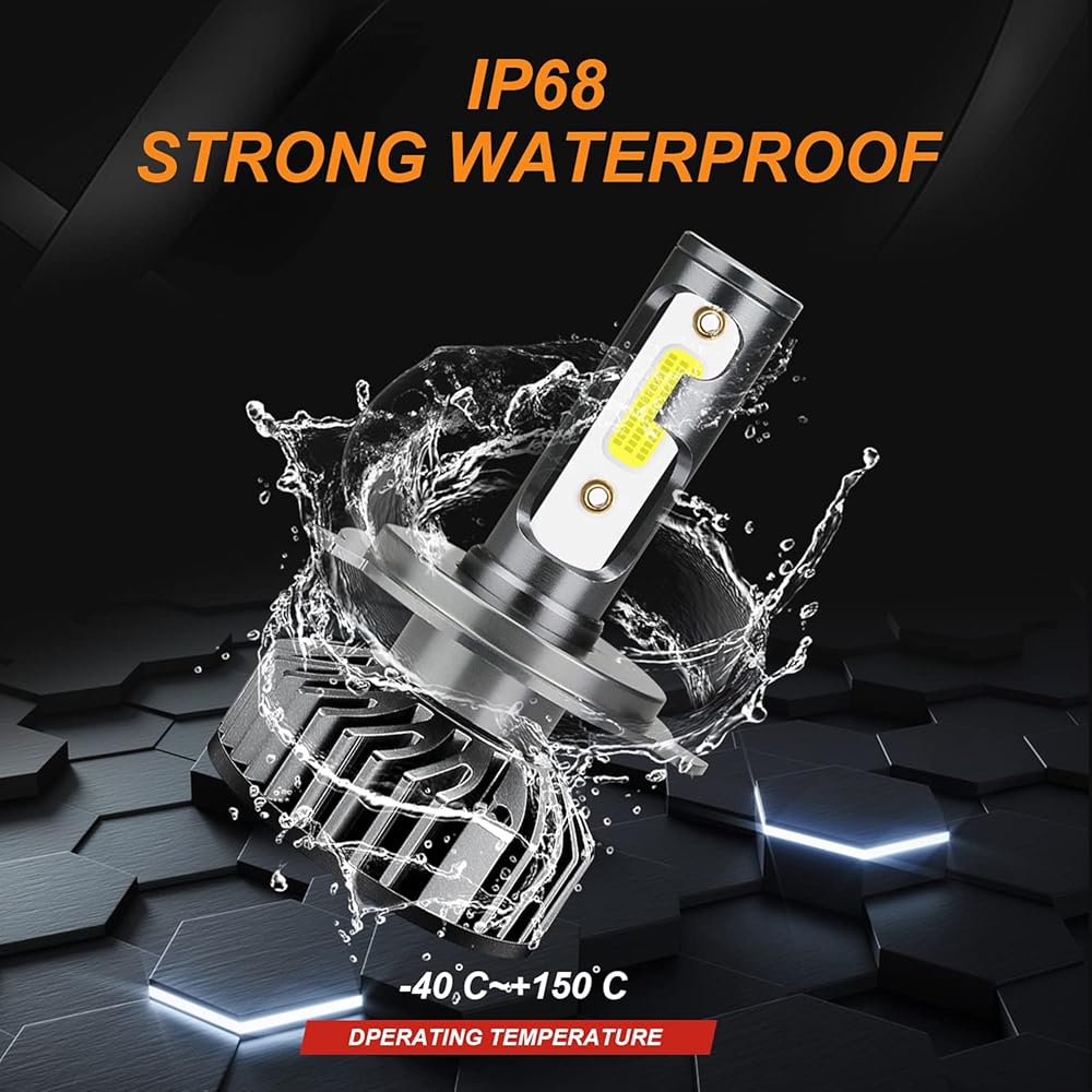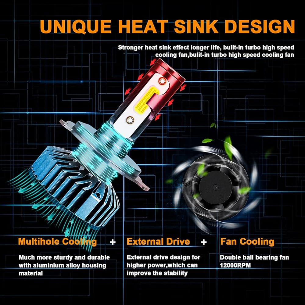 50,000Hrs LONGEVITY: Aluminum heat sink and 12,000 RPM Turbo Cooling fan with high efficiency cooling to ensures your LED headlight bulbs Over 50,000hrs of brilliant continuous light. Control driver has intelligent control chip, can monitor fan speed for optimal heat protection and performance and provide wide voltage, constant current IC.