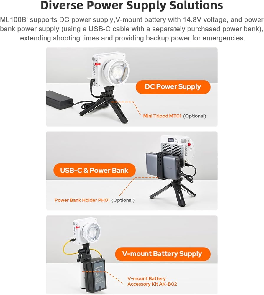 【3 Power Supply Options】Choose from three different power supply options for this dual-color video light: V-lock battery, NP series batteries, or DC adapter. This gives you the flexibility to select the power source that best suits your specific requirements.