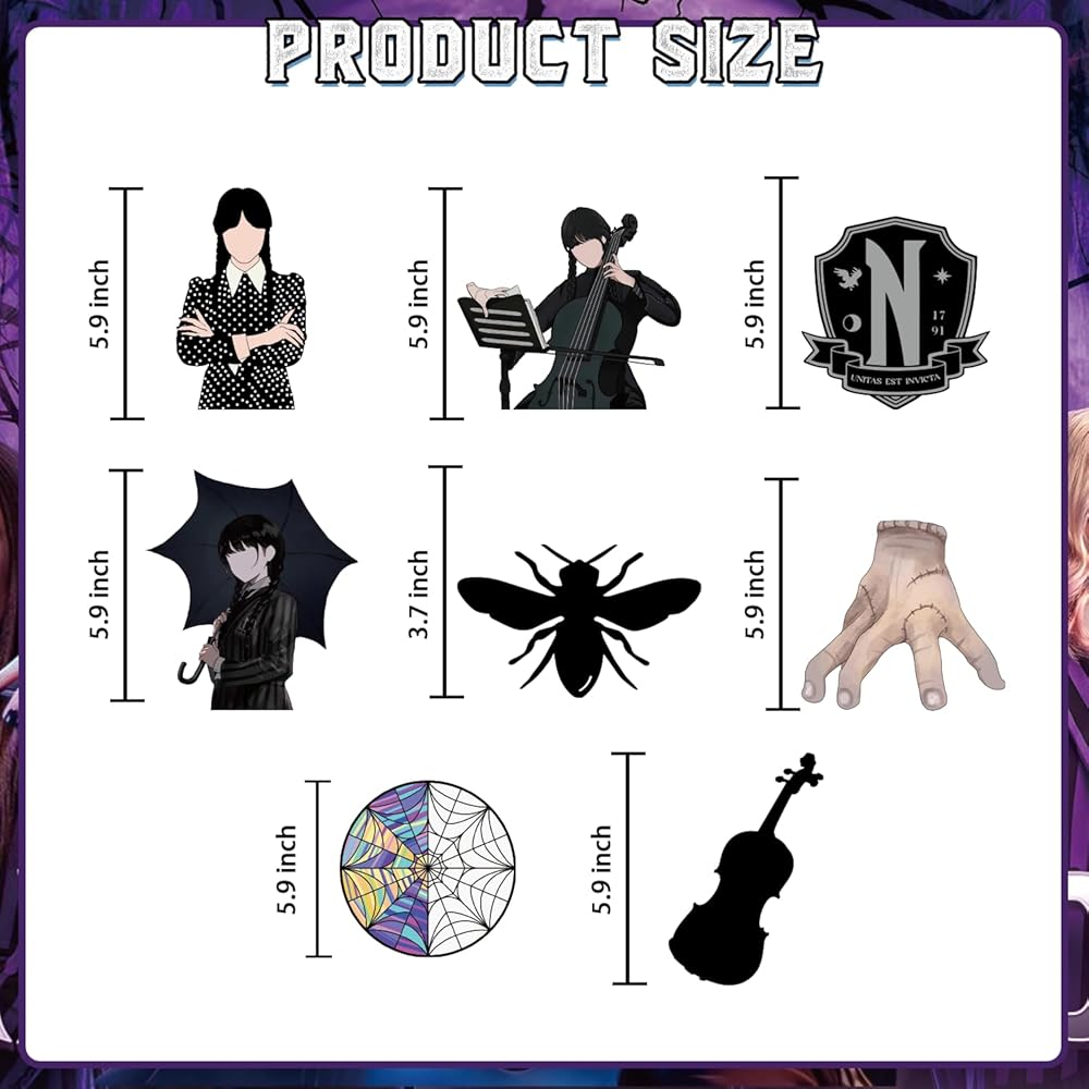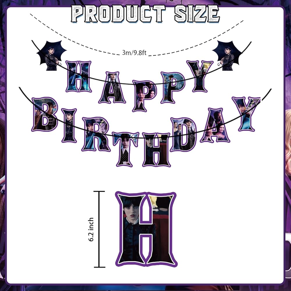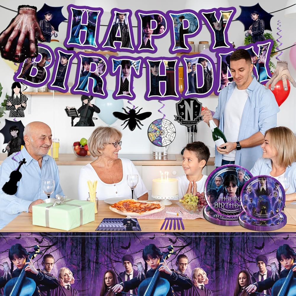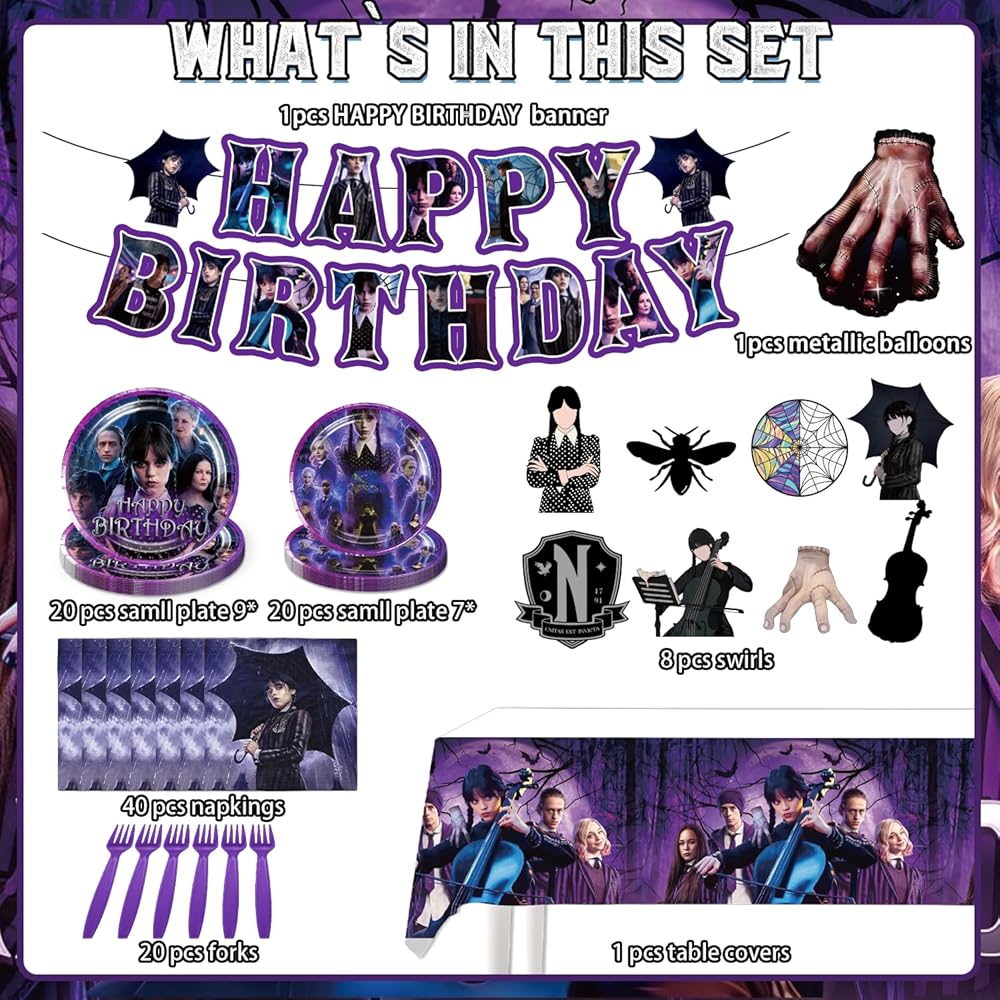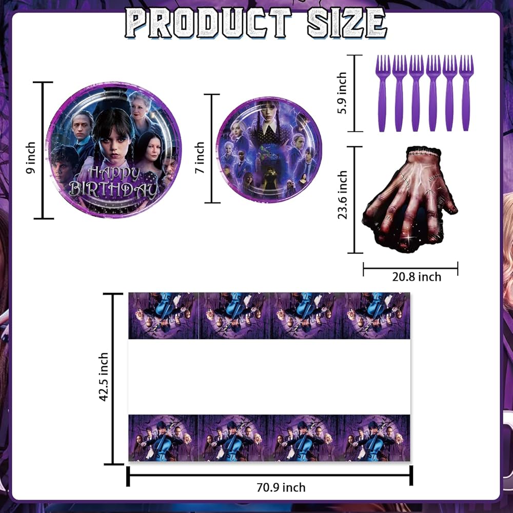 Package contents: You will receive 1 Wednesday banner, 8 hanging decorations, total 40 plates(7in and 9in ), 40 napkins, 20 forks, 1 hand shaped foil balloon, and 1 tablecloth(108x54 inches), Bring a cool vibe to your wednesday birthday party