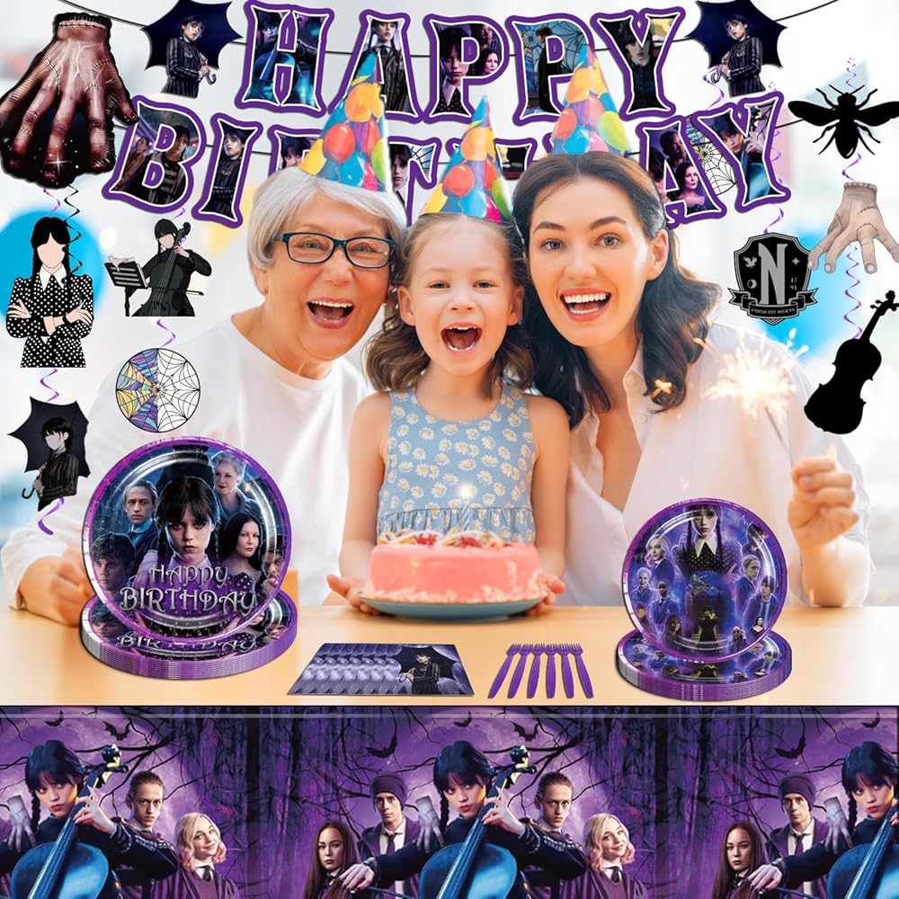 Easy to use: The Wednesday birthday decorations just need a few minutes to finish, you'd better prepare them in advance to make sure nothing goes wrong. lay the tablecloth directly covering the table, open the wednesday tableware, and use it. There is no need to waste your time and energy, just enjoy the birthday party with your family or friends