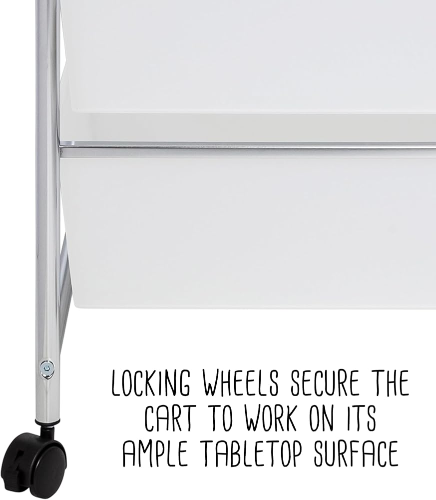 Locking wheels secure the cart to work on its ample tabletop surface