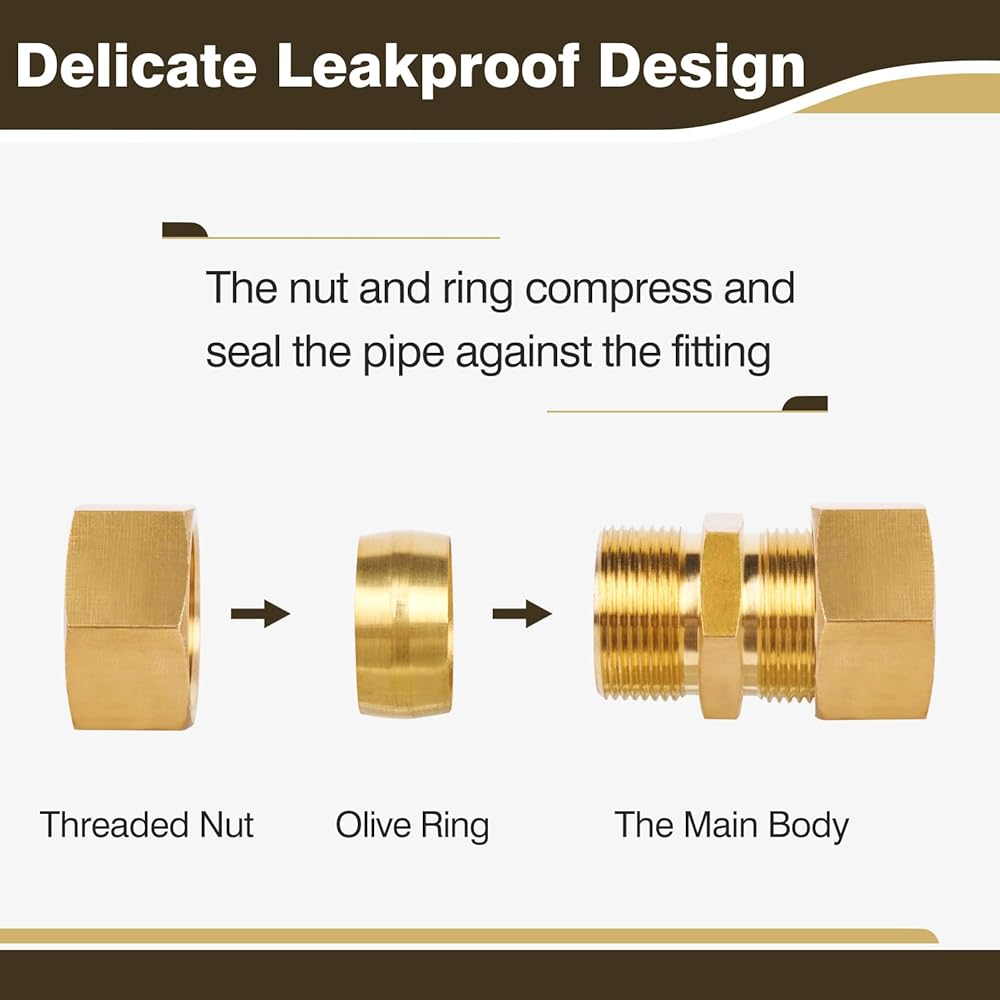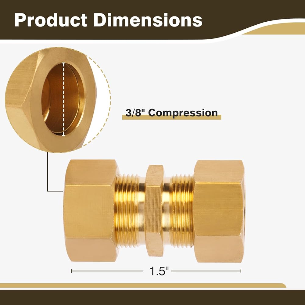 - 3/8" Compression on both ends. Consists of three main parts: olive, main body, and nut.
