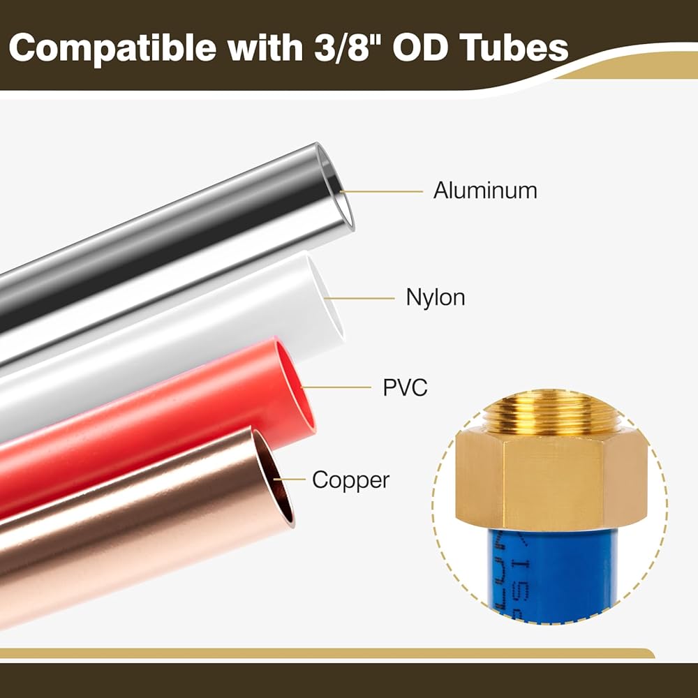 - Compatible with 3/8" OD copper, PVC, nylon, aluminum, and other thermoplastic tubing.