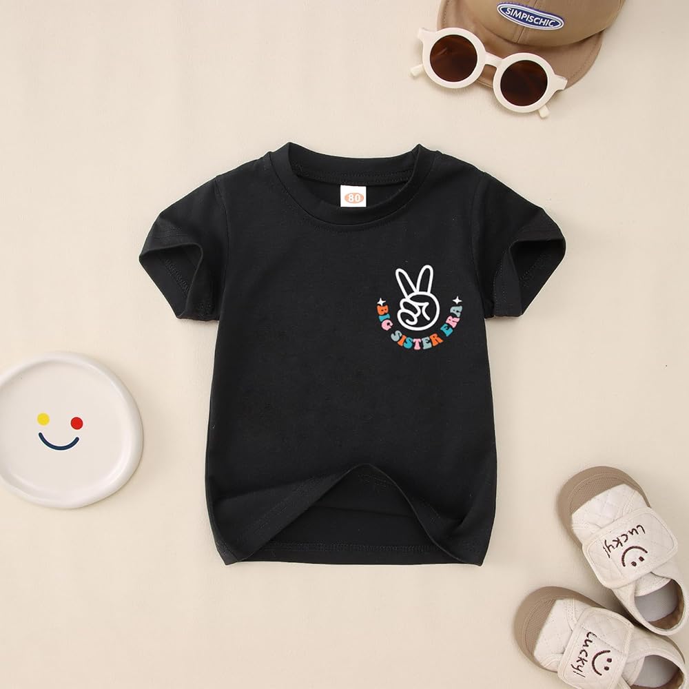 【Feature】Short sleeve shirts for little girl.Round neck tees toddler girls. In My Big Sister Era letter printed. With its vibrant colors and sun, star print graphic, our big sister announcement shirt is the perfect way to celebrate your little one's transition to big sister.